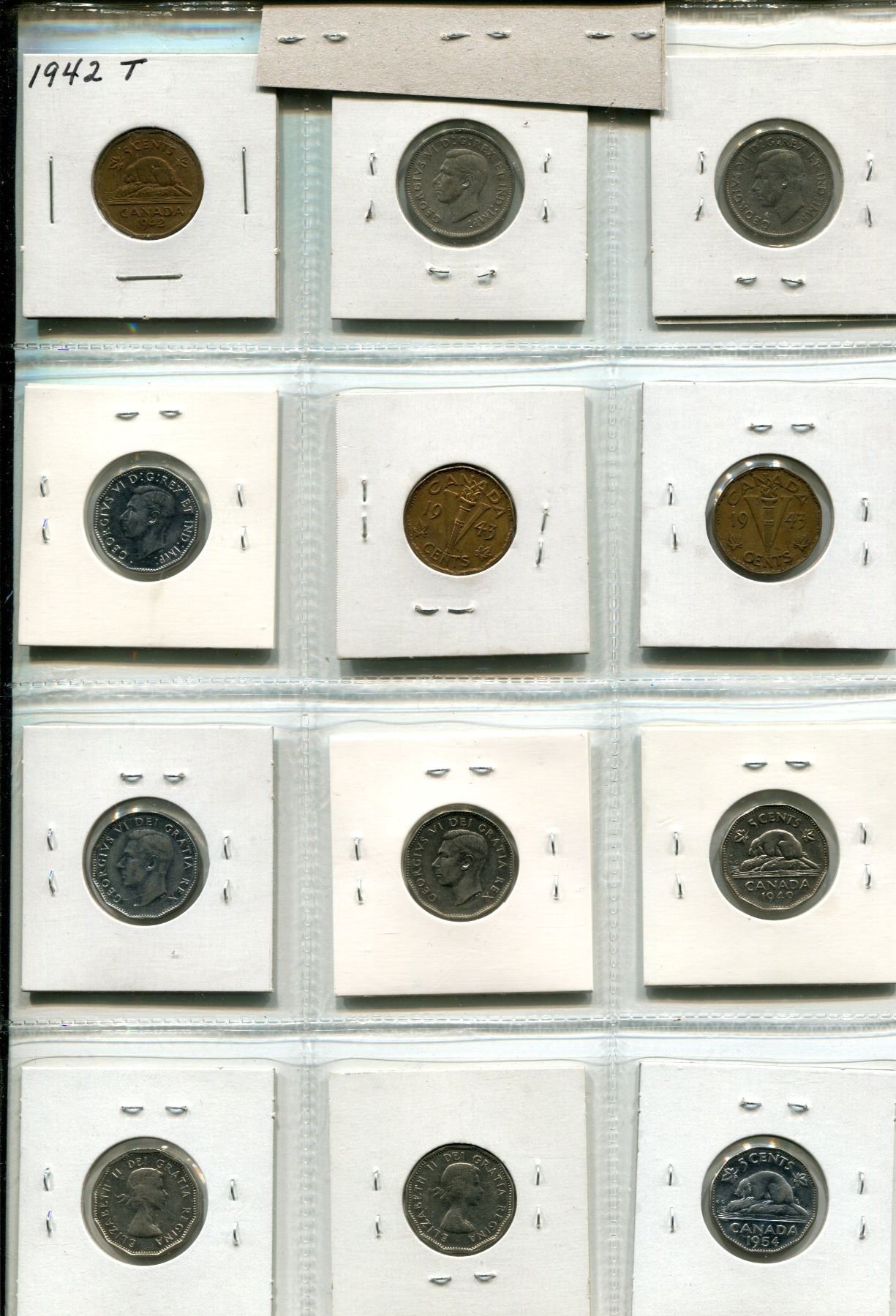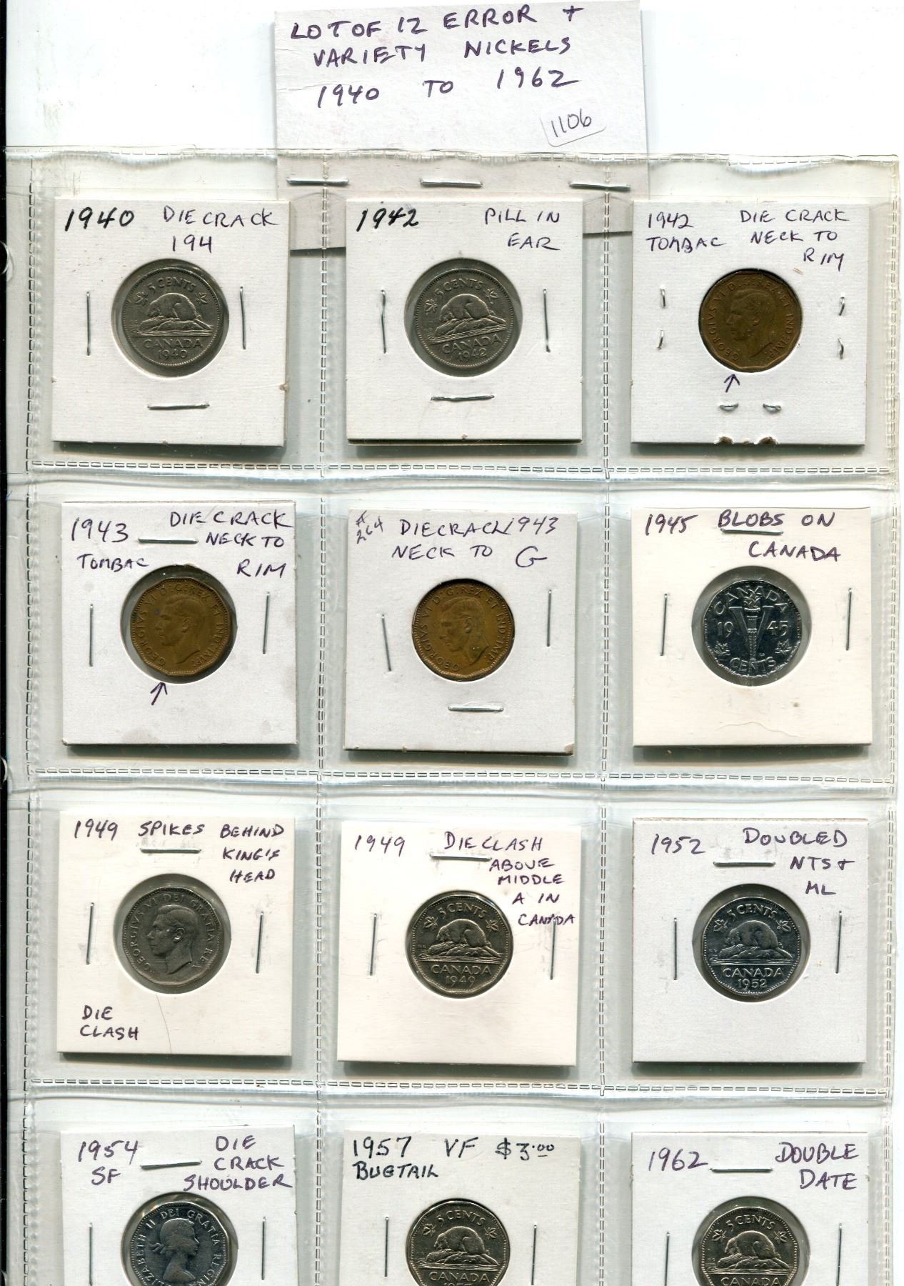 Lot of 12 Canadian Nickel Errors & Varieties. Includes Die Cracks, Pill in Ear, Blobs, Spikes behind king’s head, Die Clash, Doubled Letters, Shoulder Die Crack, Bug Tail & Double Date. Coins date 1940 to 1962. Rarely seen.