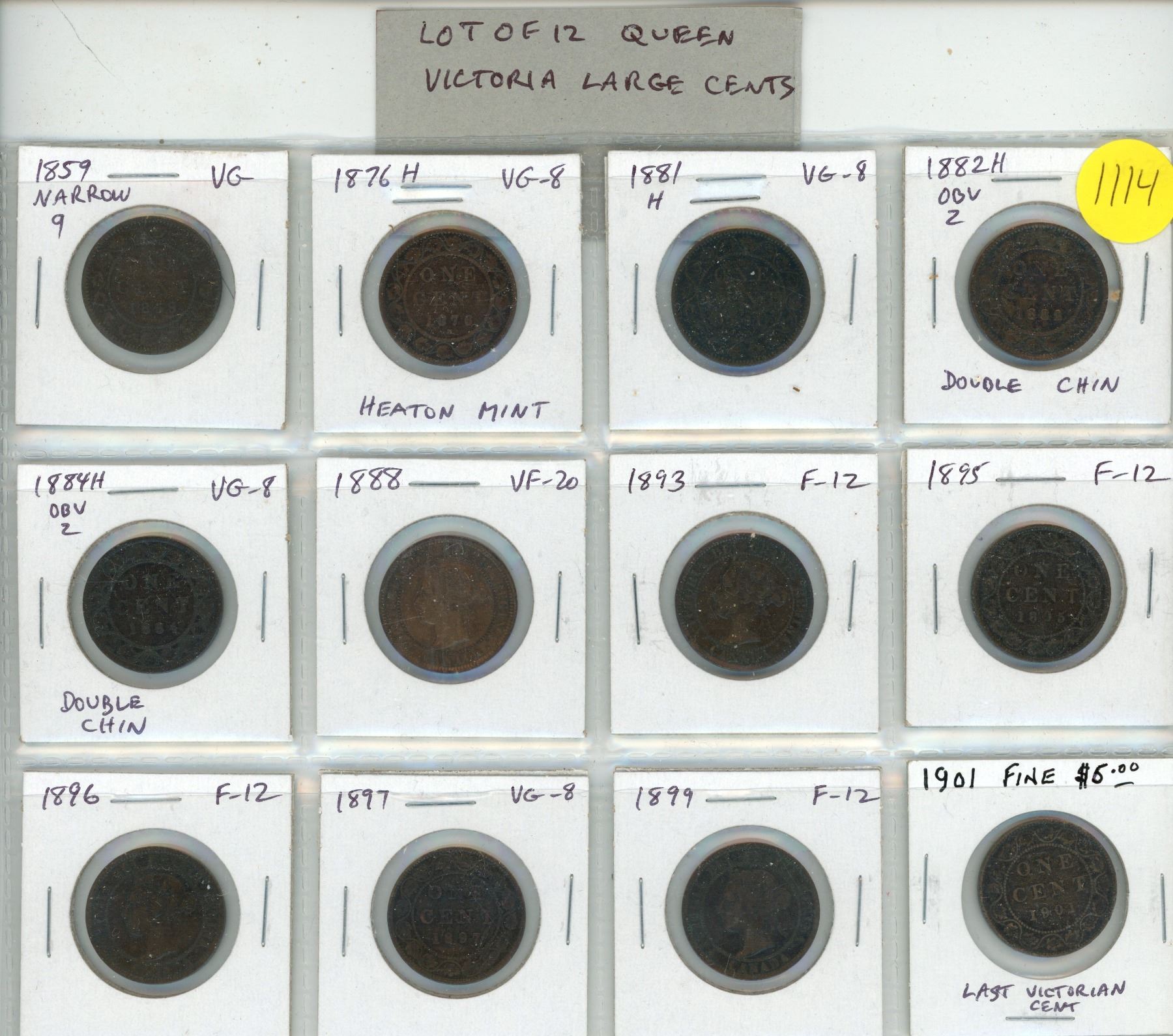 Lot of 12 Canadian Victorian Large Cents 1859 – 1901. Includes 1859 Narrow 9, 1876H, 1881H, 1882H Obverse 2 (Double Chin), 1884 Obverse 2 (Double Chin), 1888, 1893, 1895, 1896, 1897, 1899 & 1901. Coins grade VG-8 to VF-20. A nice selection.