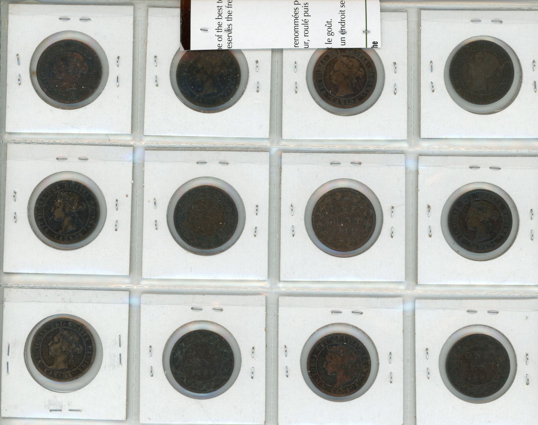 Lot of 12 Canadian Victorian Large Cents 1859 – 1901. Includes 1859 Narrow 9, 1876H, 1881H, 1882H Ob