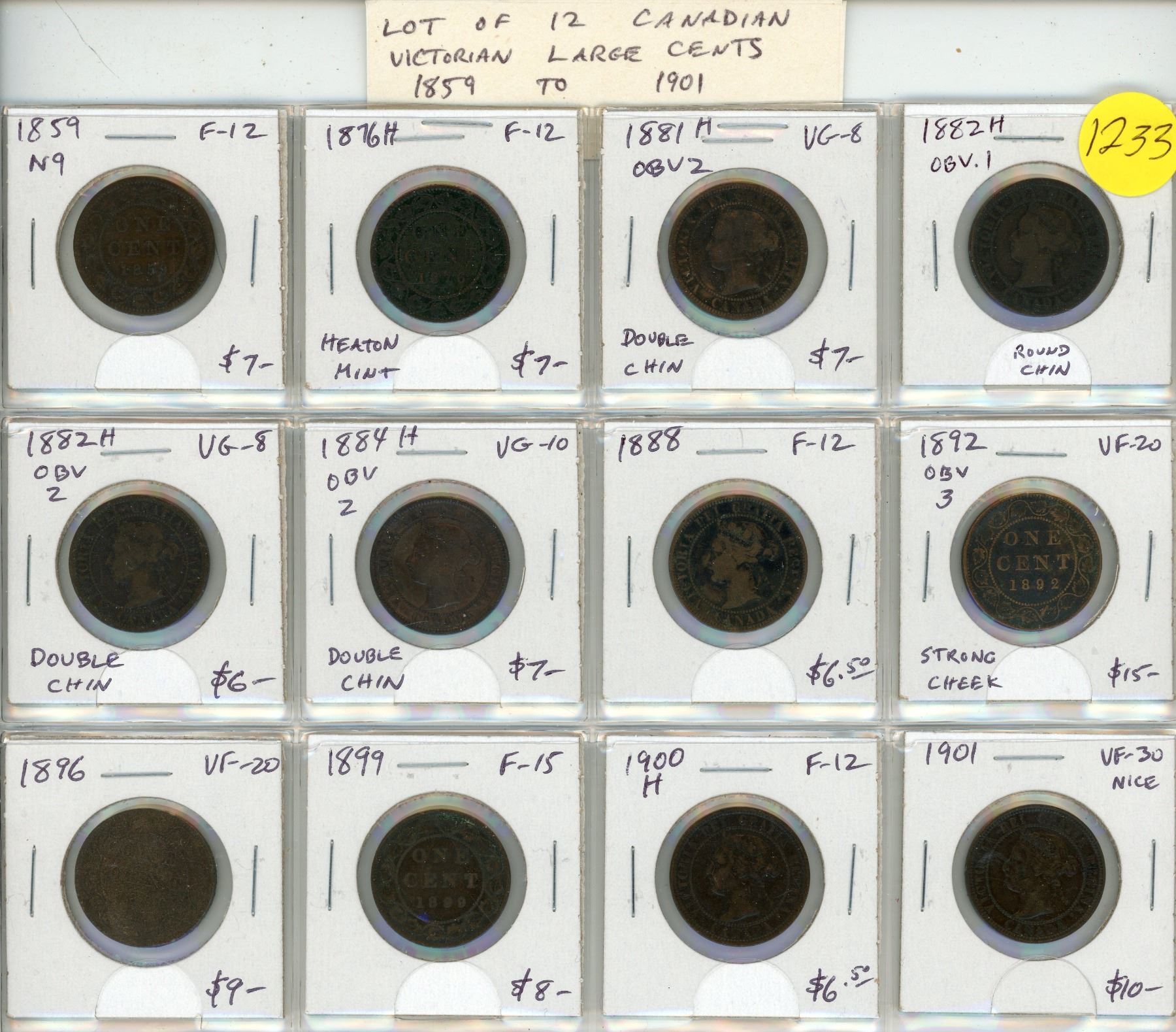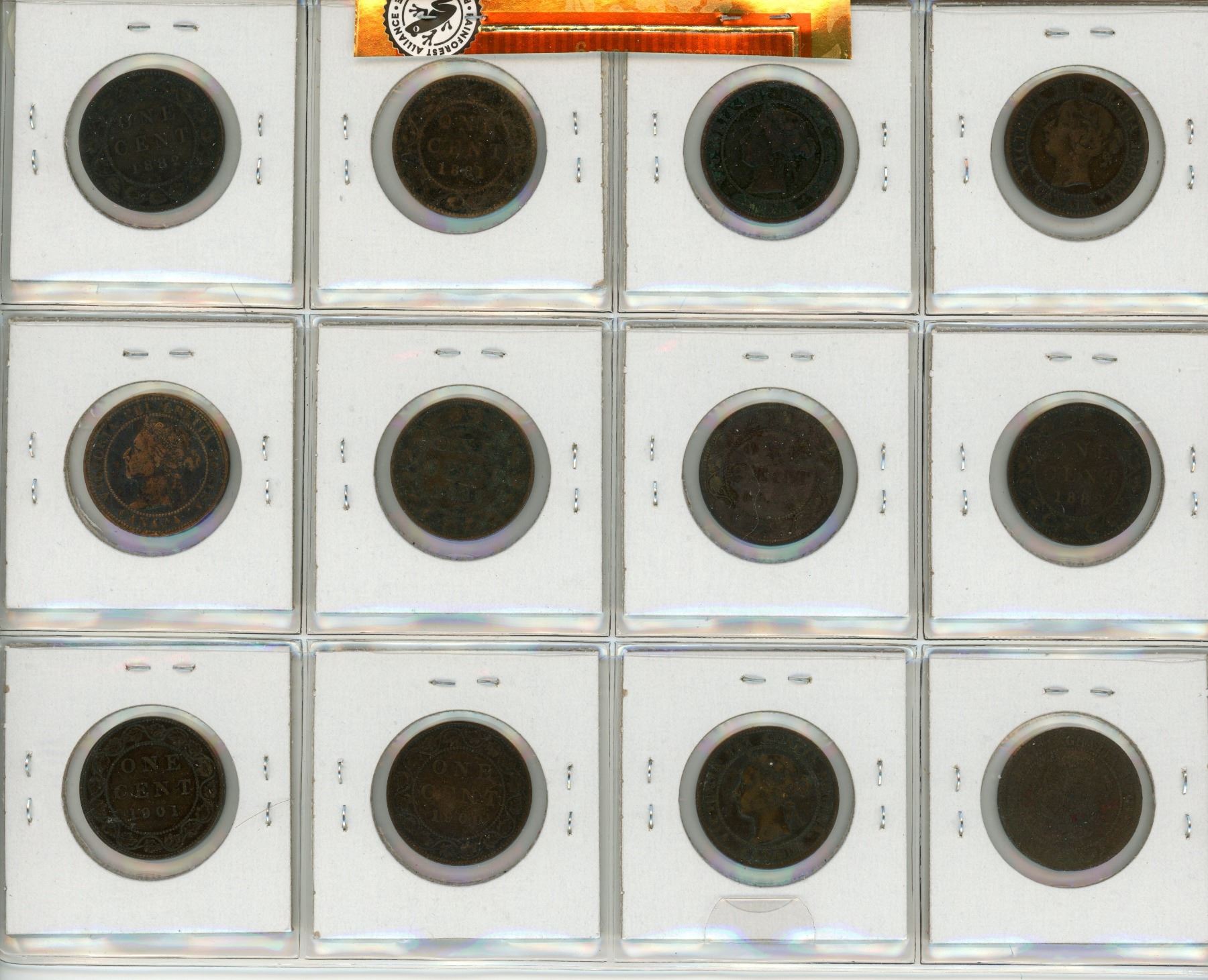 Lot of 12 Canadian Victorian Large Cents 1859 to 1901. Includes 1859 Narrow 9, 1876H, 1881H Obverse 2 (Double Chin), 1882H Obverse 1 (Round Chin), 1882H Obverse 2 (Double Chin), 1884H Obverse 2 (Double Chin), 1888, 1892 Obverse 3 (Strong Cheek), 1896, 1899, 1900H & 1901. Coins graded VG-8 to VF-30. A nice selection.