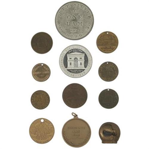 <B>Lot of 12 Presidential and Candidate Medals,</B></I> including: two William Henry Harrison “The People’s Choice”; John C. Freemont; Benjamin Harrison; James Garfield; “Executive Financiering sic 1837”; Ulysses Grant; Lincoln, National Republican Convention, 1906; Thomas E. Dewey; FDR and John Nance Garner; Dwight Eisenhower; Bryan So Called Dollar, “United Snakes of America”; and, “Dinner With Ike, 1960”. Various sizes. Most near fine or better.<BR><BR><b>Shipping:</b> Miscellaneous Collectibles, Smal (<a target="_blank" href="http://www.heritageauctions.com/common/shipping.php">view shipping information</a>)