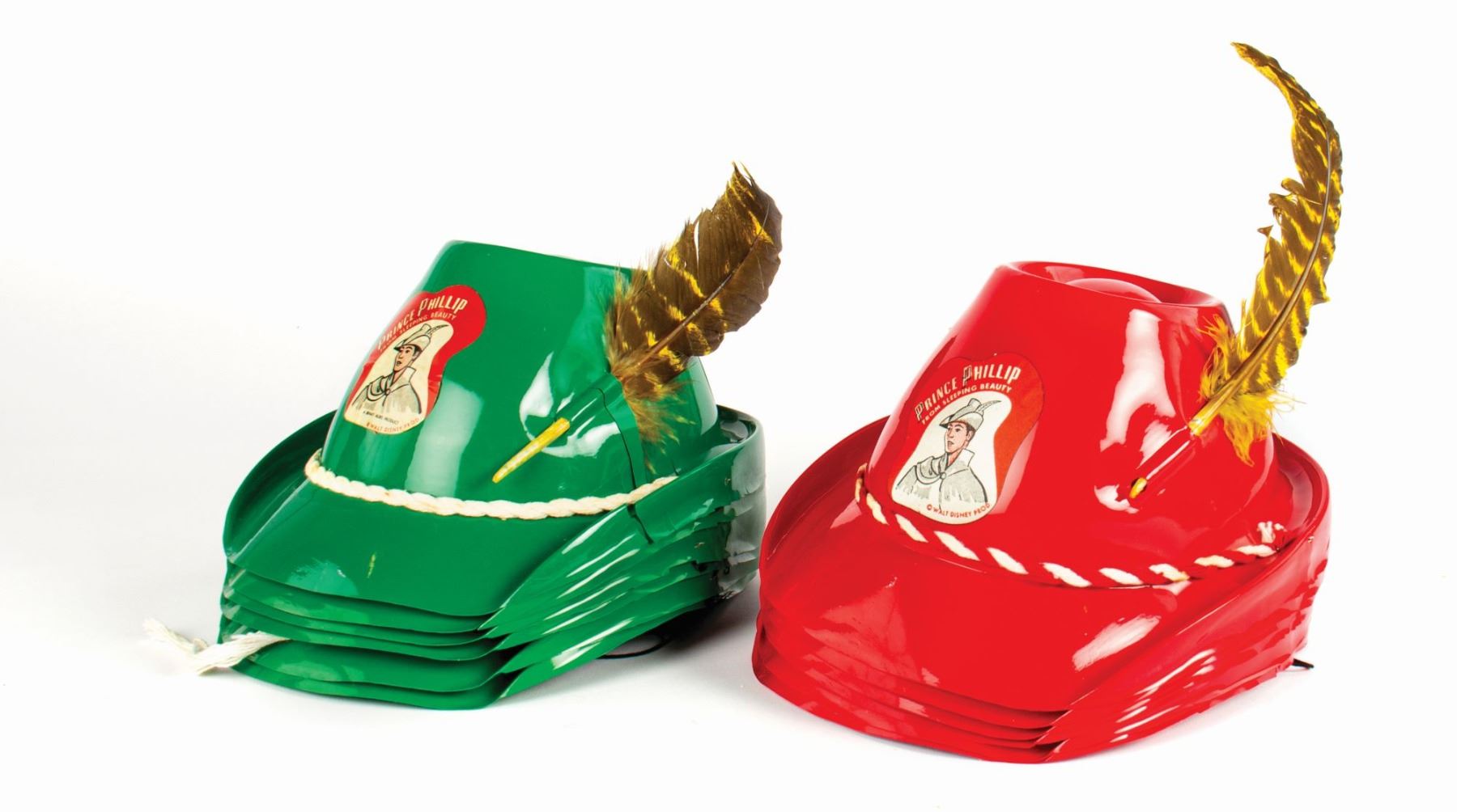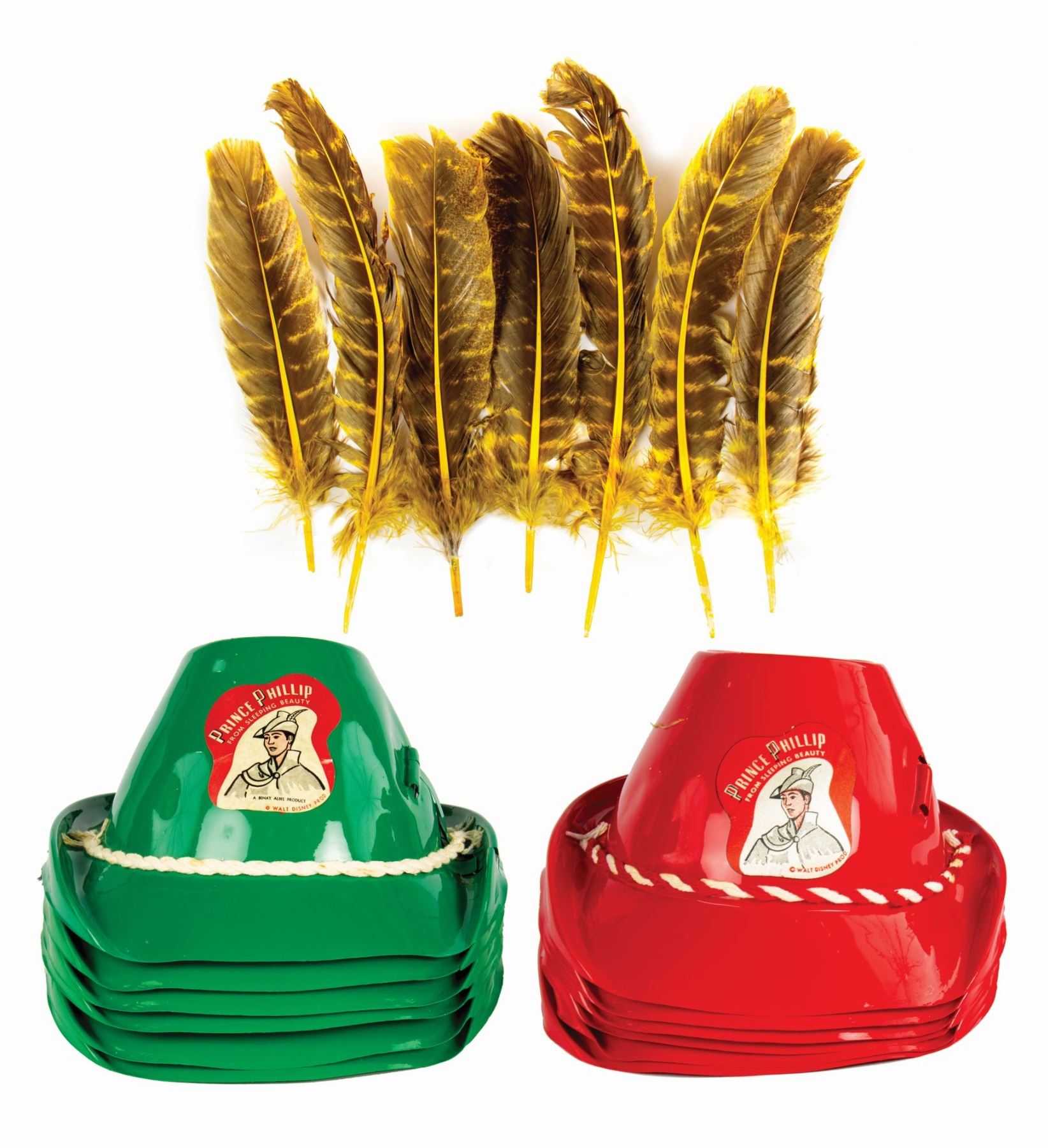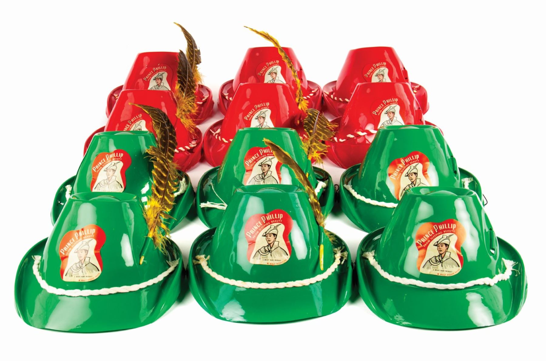 (Disneyland, c.1950s) A group of (12) Prince Phillip souvenir hats with (7) original feathers from a movie theater premiere of Sleeping Beauty. These child size souvenir hats are made of plastic and feature imagery of Prince Phillip from Sleeping Beauty. This group includes (6) red hats and (6) green hats. The openings of the hats measure approximately 6" in diameter, and the set is in good condition overall with minor areas of creasing and some tearing to the hat brims.