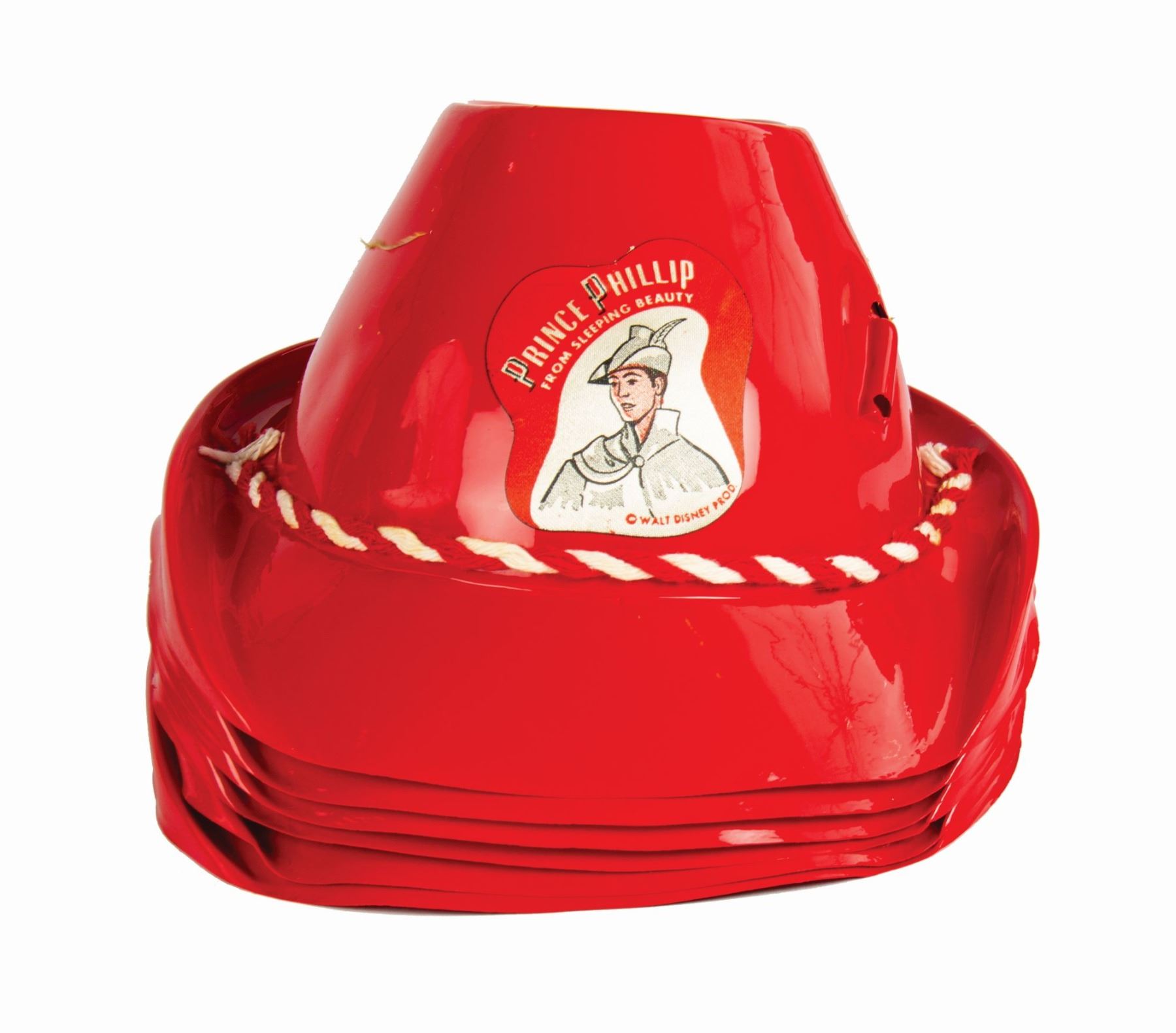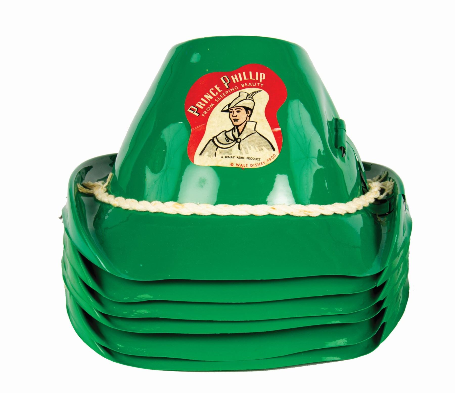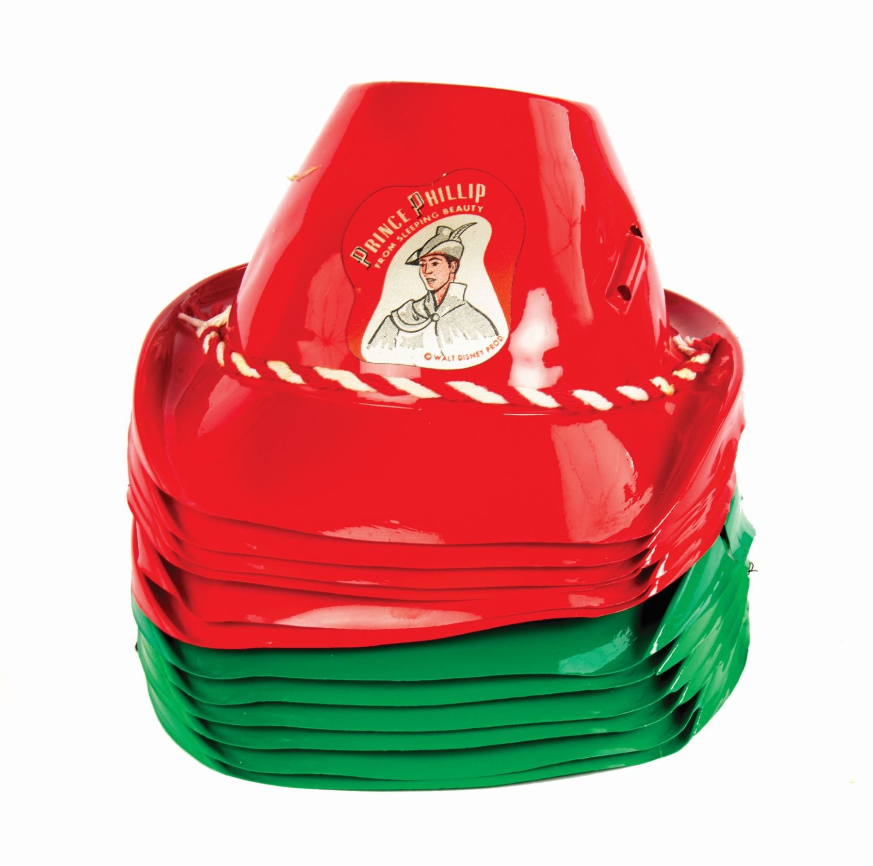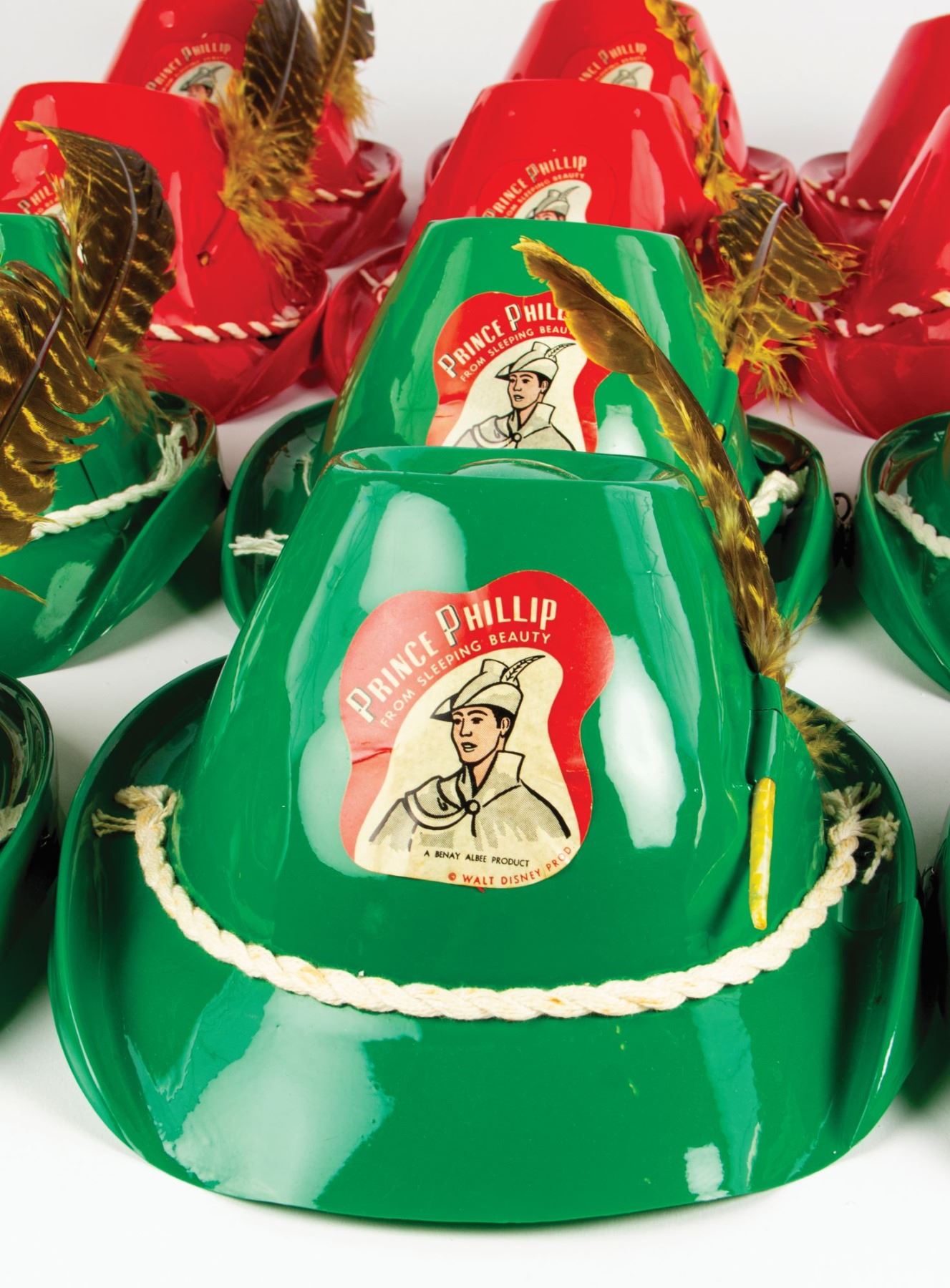 (Disneyland, c.1950s) A group of (12) Prince Phillip souvenir hats with (7) original feathers from a movie theater premiere of Sleeping Beauty. These child size souvenir hats are made of plastic and feature imagery of Prince Phillip from Sleeping Beauty. This group includes (6) red hats and (6) green hats. The openings of the hats measure approximately 6" in diameter, and the set is in good condition overall with minor areas of creasing and some tearing to the hat brims.