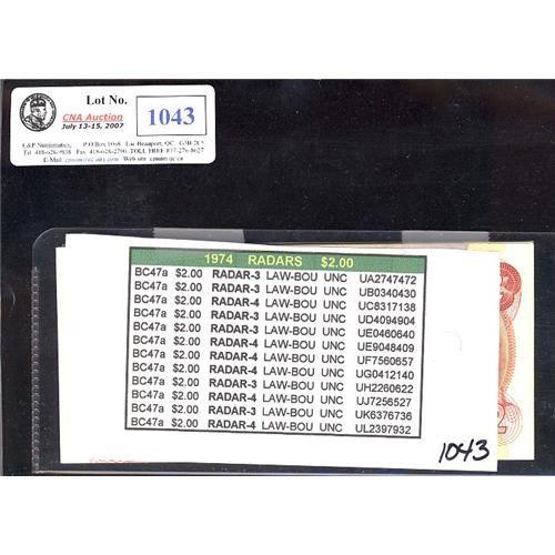 Lot of 12 "RADAR" notes. BC-47a 1974 $2 Lawson-Bouey, mostly DIFFERENT PREFIX notes. Includes UA2747