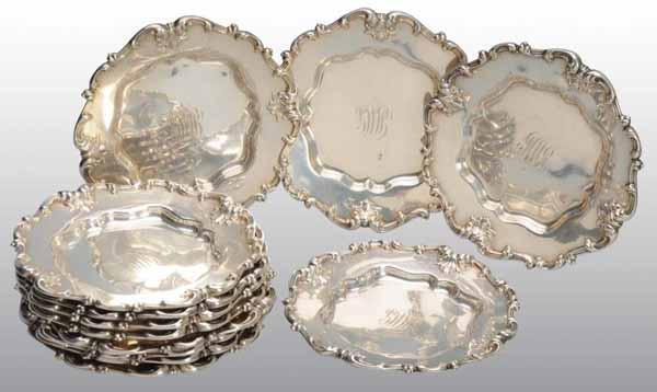 Description Weighs 41.4 troy ounces. Each plate with a shaped edge, scrolls, and the centers with shaped edges around initials. Condition (Very Good). Size All: 6" Dia.