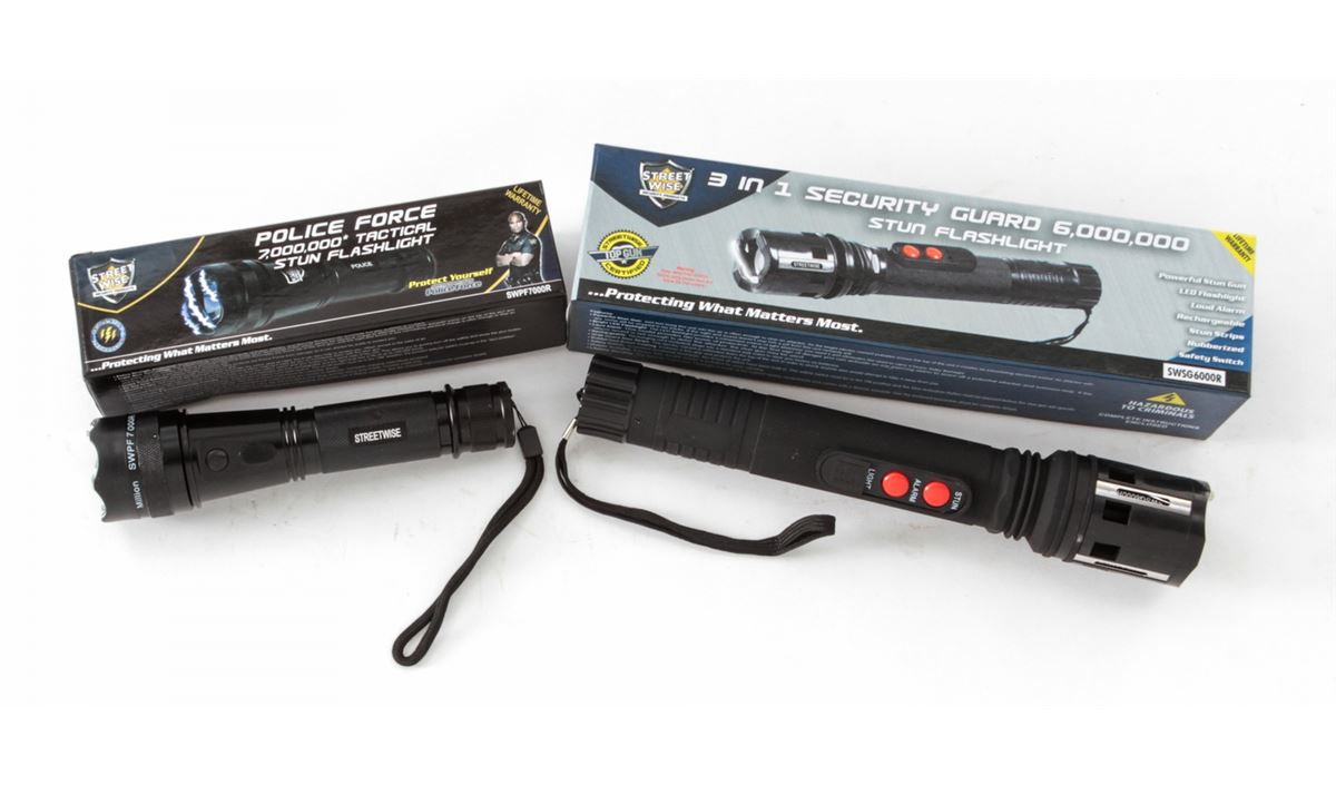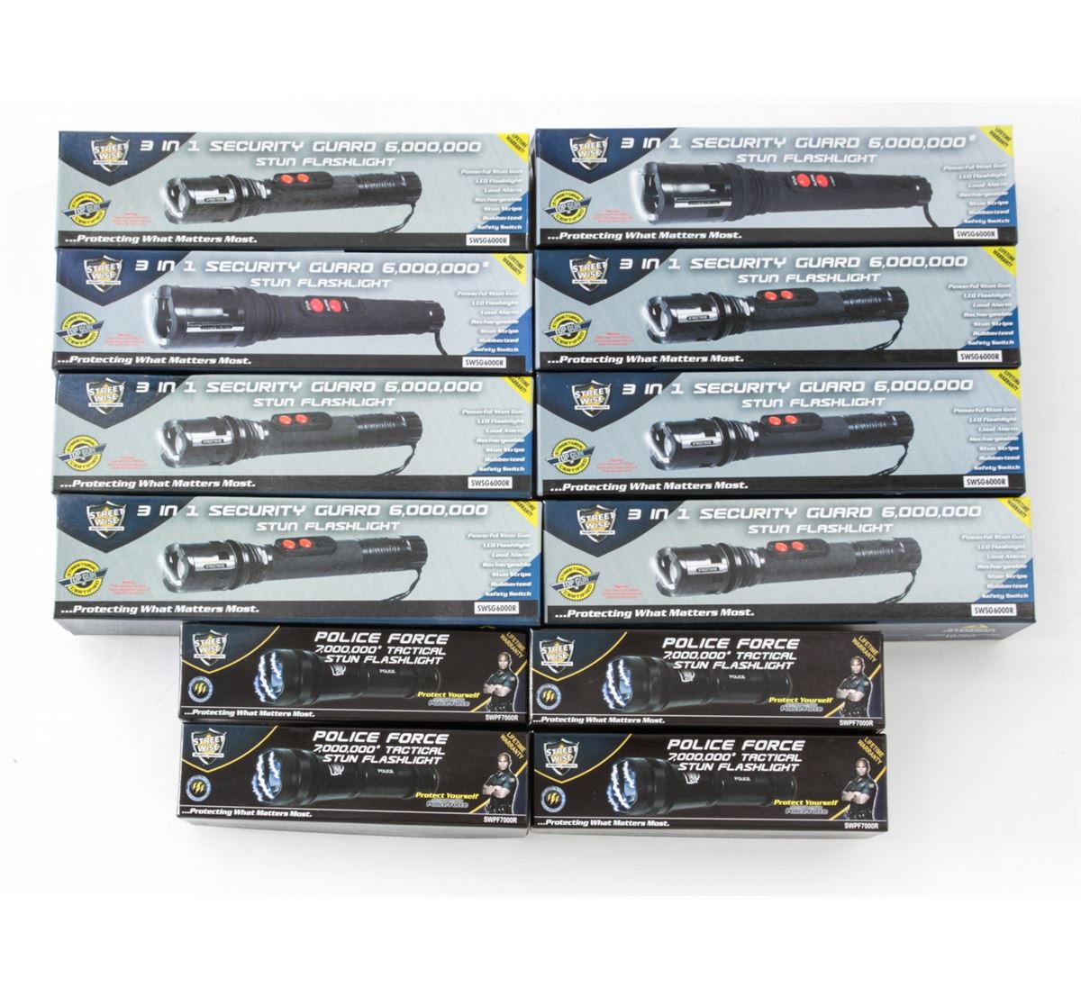 Lot of Twelve (12) StreetWise 3-in-1 Security Guard and Police Force Stun Flashlights. All brand new in original boxes with cases and instructions. Retails @ $600/lot. Est.: $300-$400/lot. (Field Time)