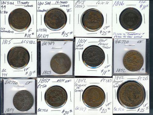 Lot of 12 TOKENS. LC-41a1, LC24a1, lees 31, UC-6a1, LC-54d2, LC-53a1, PC-5b (4), PC1a3, PC2b. Grades vary from F-12 to EF-40.