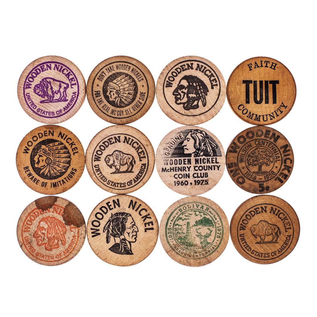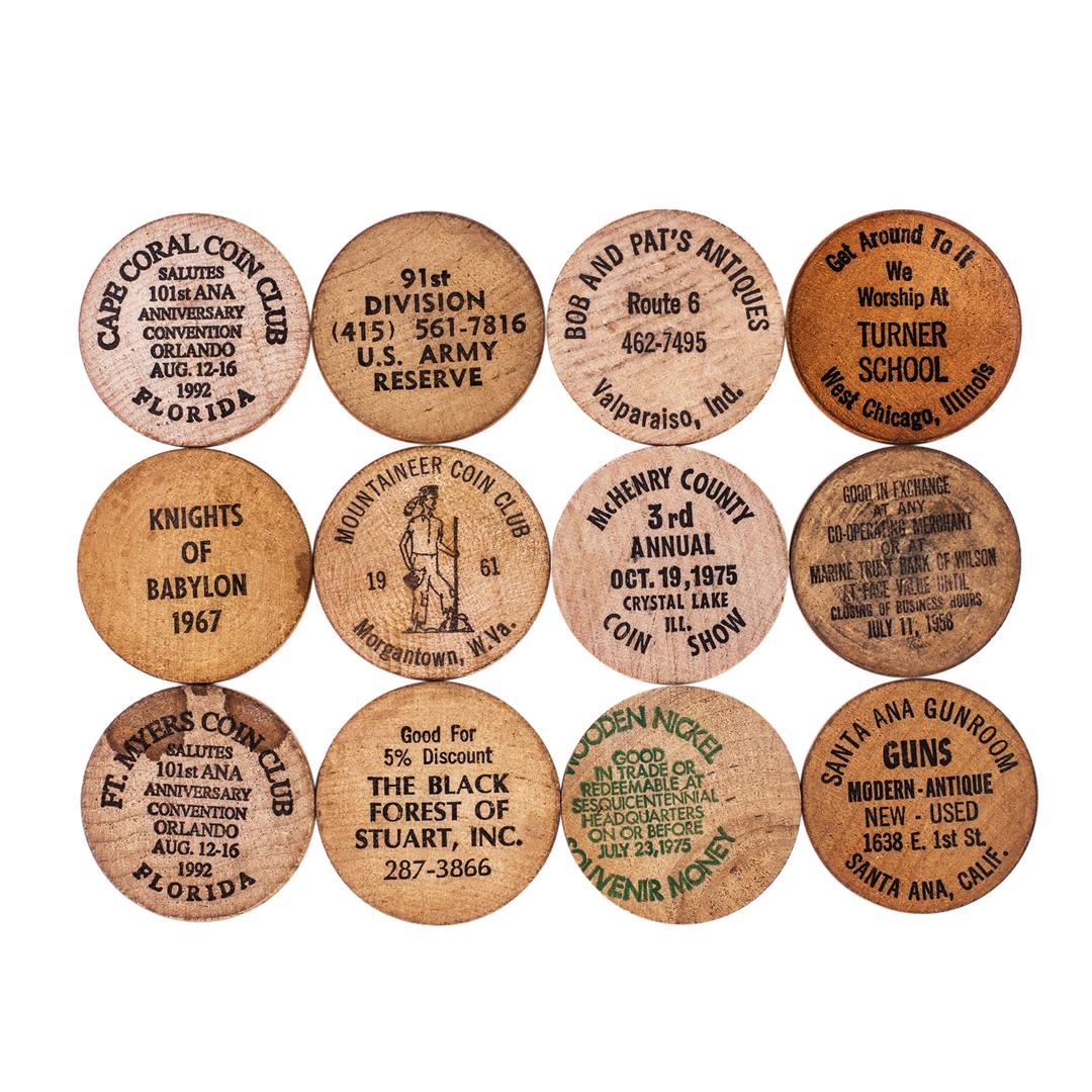 One Lot of (12) Wooden Nickels.