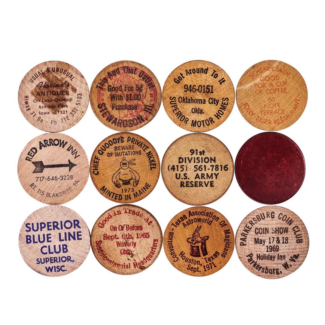 One Lot of (12) Wooden Nickels.