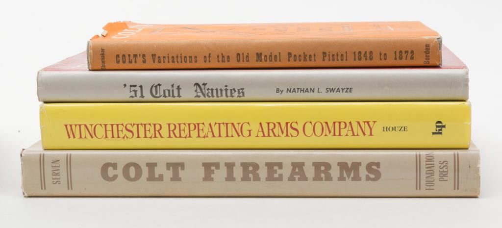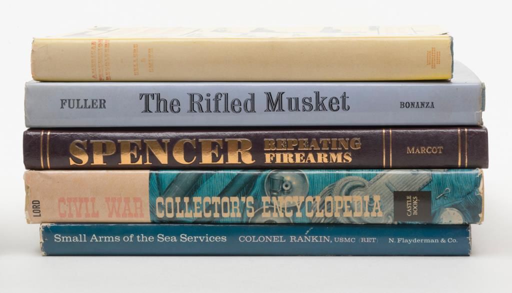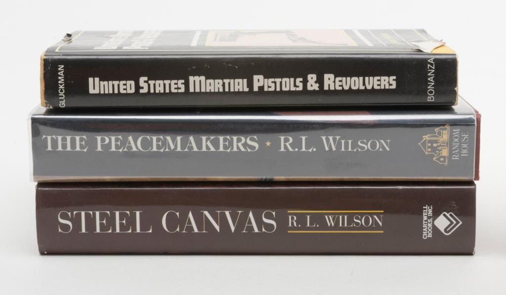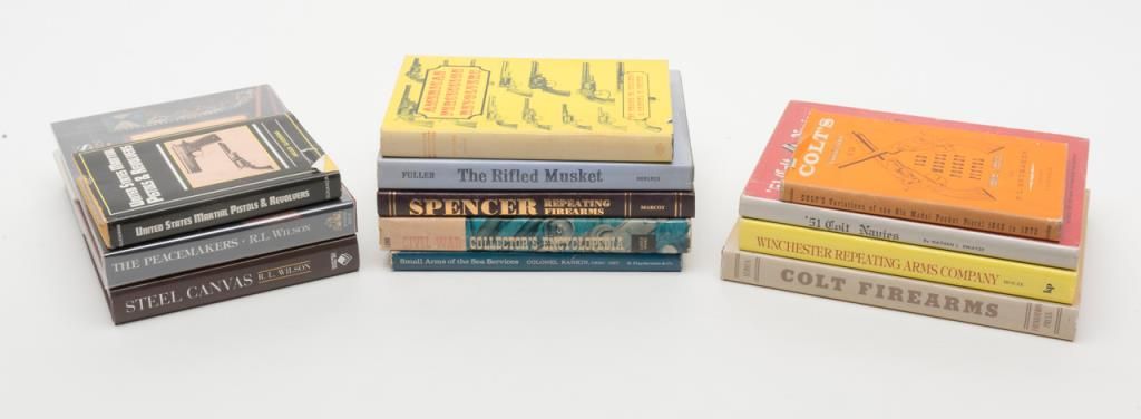 Lot of 12 collector books as follows. Number 1 is “‘51 Colt Navies” by Swayze with dust cover intact and in fine to near excellent condition. Number 2 “United States Martial Pistols and Revolvers” by Arcady Gluckman with dust cover intact in verygood condition. Number 3 “American Percussion Revolvers” by Sellers and Smith dust cover intact in good condition. Number 4 “Colts Variations of the Old Model Pocket Pistol” by Shoemaker with dust cover intact in very good condition. Number 5 “The Rifled Musket” by Claud E. Fuller with dust cover intact in very good condition. Number 6 “Spencer Repeating Firearms” by Marcot in very good condition. Number 7 “Civil War Collectors Encyclopedia” by Francis B. Lord with dust coverintact in good condition. Number 8 “Small Arms of the Sea Service” by Robert H. Rankin with dust cover intact in very good condition. Number 9 “Winchester Repeating Arms Company by Houze dust cover intact in very good condition. Number 10“Colt Firearms” by James Serven 7th edition with dust cover intact in very good condition. Number 11 “The Peacemaker” by R.L. Wilson with dust cover intact in near excellent condition. Number 12 “Steel Canvas” by R.L. Wilson dust cover intact in
