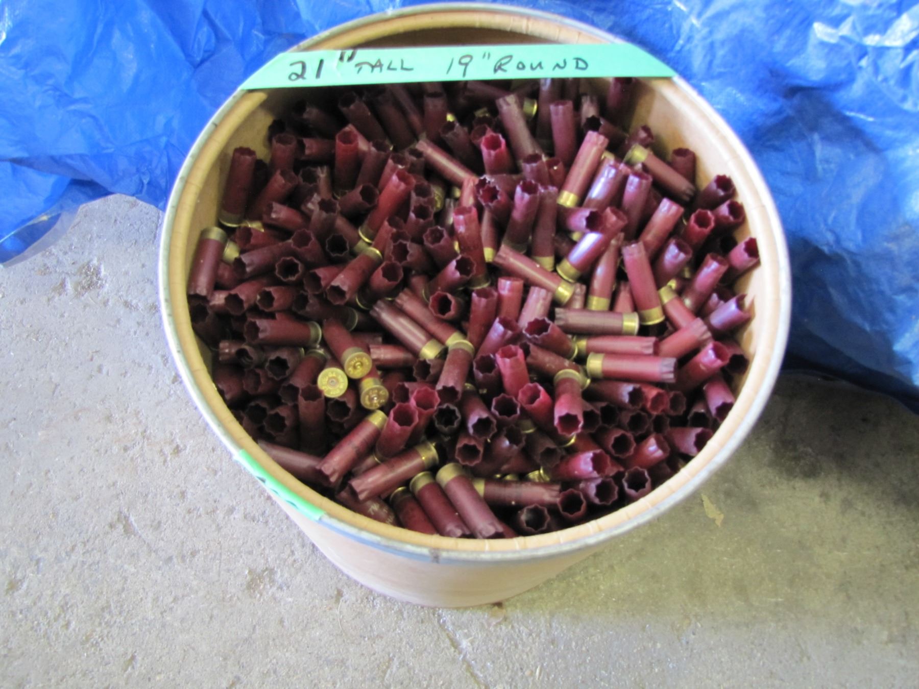 Lot of 12 gauge shotgun shell hulls in a paper barrel 21 inches tall by 19 inches round ; Fair warning shipping can be expensive