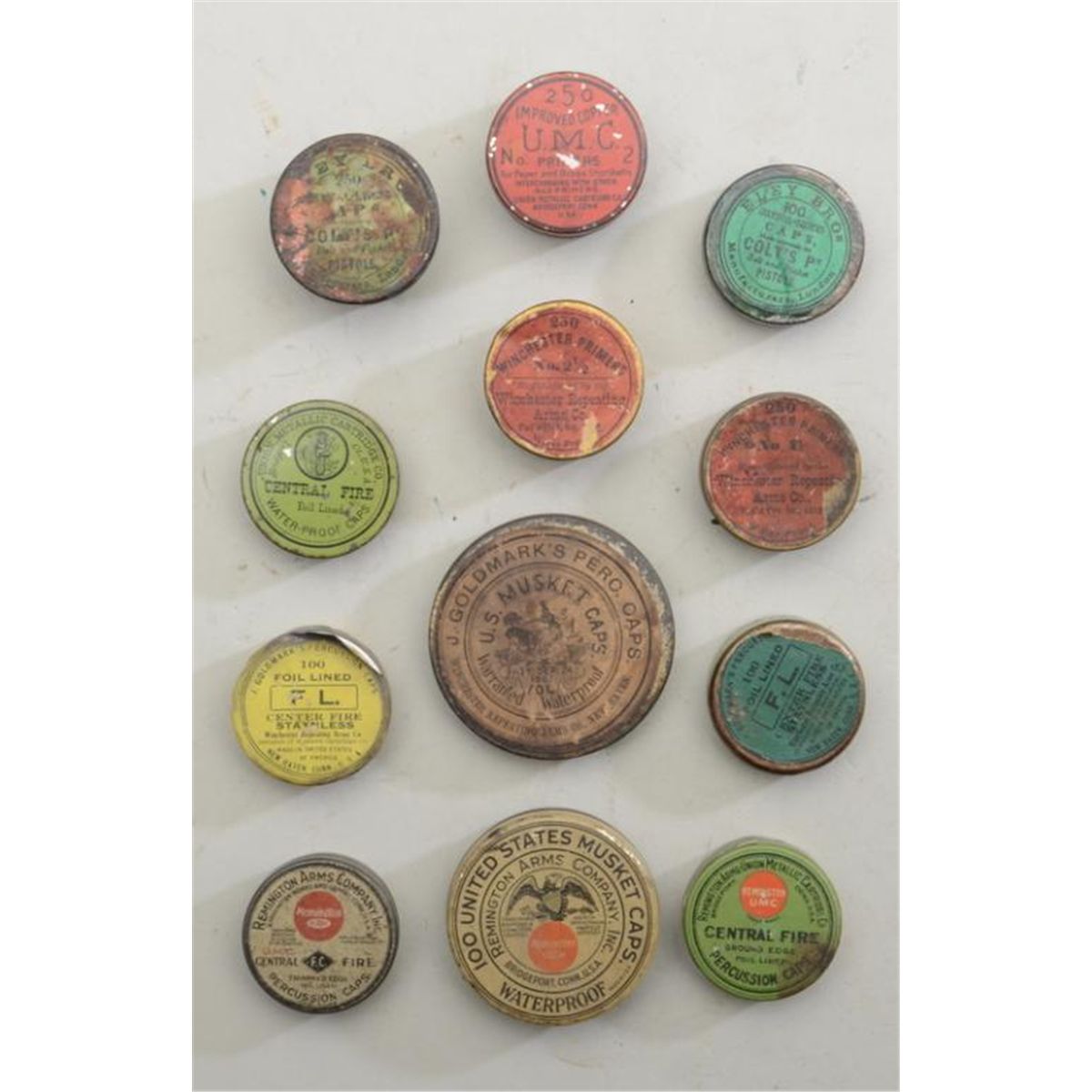 Lot of 12 misc. cap tins by various makers including UMC, Eley Bros., Goldmark’s, Winchester and Remington-UMC in fair to good condition; great to add to that cased set or to display with percussion guns. Est.:$50-$100.