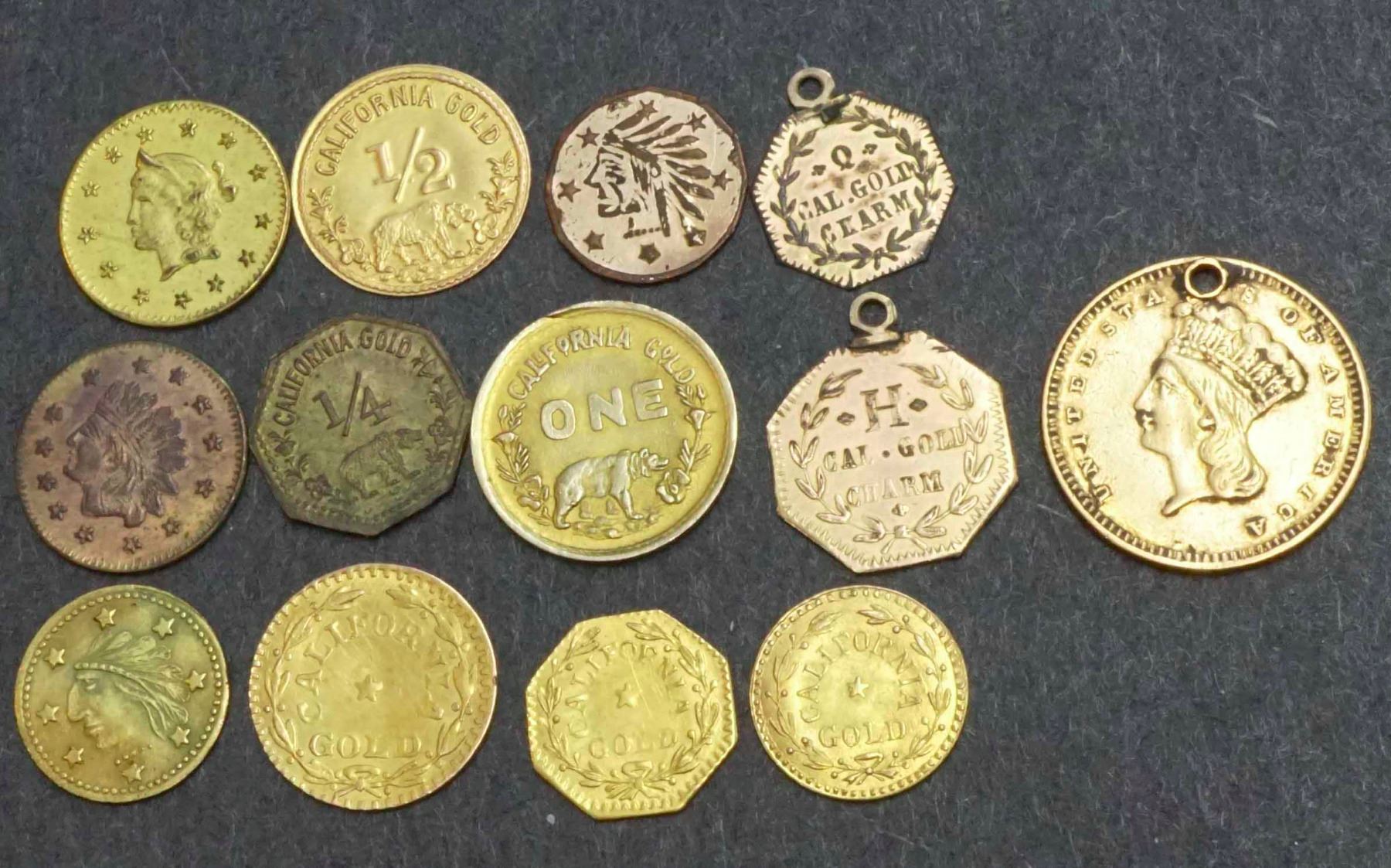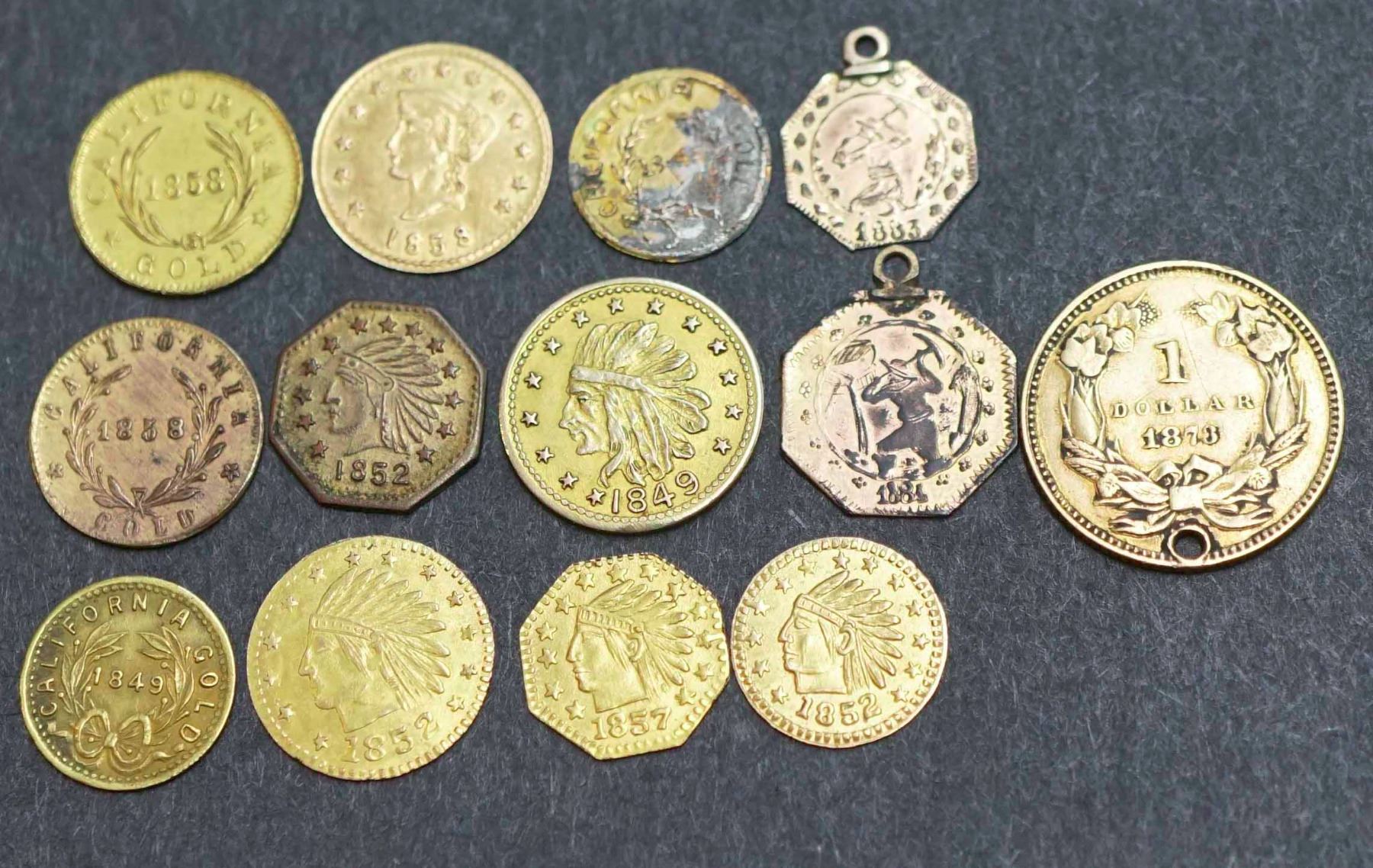 Lot of 12 pieces Undenominated "California Gold" Unresearched, some old, some more recent. Also included is a US $1 gold coin, 1873, pierced. Total 13 pieces. An interesting lot, worth a closer look.
