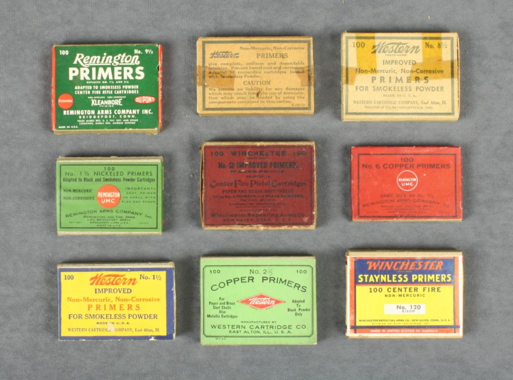 Lot of 12 small boxes of primers by Remington-UMC, Western, Winchester and Remington in overall good to very good condition. Est.: $75-$150.