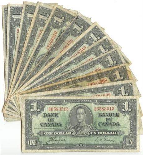 Bank of Canada Lot of 12 x $1.00 note 1937 in Very-Good to Fine, BC-21d Coyne Towers.