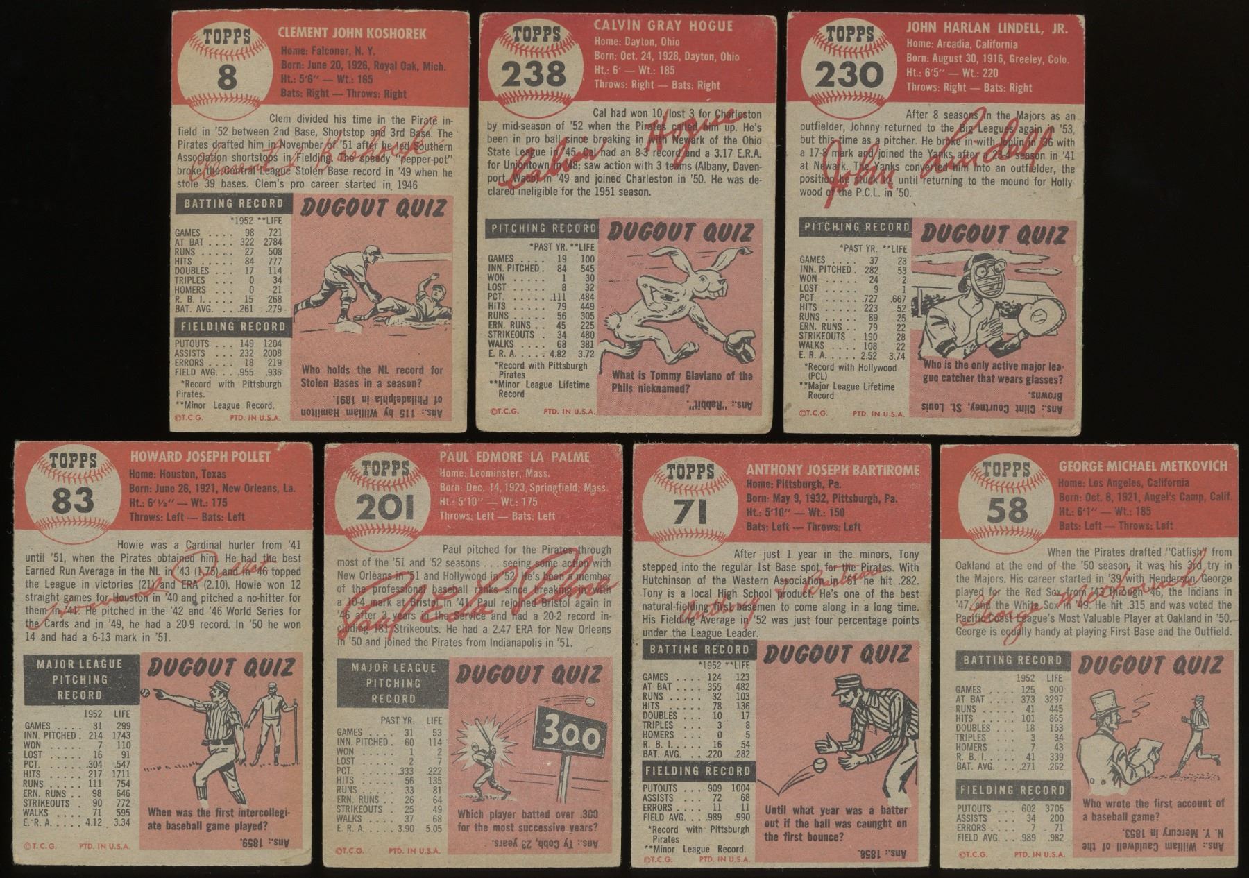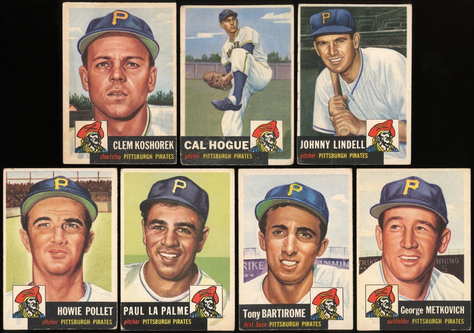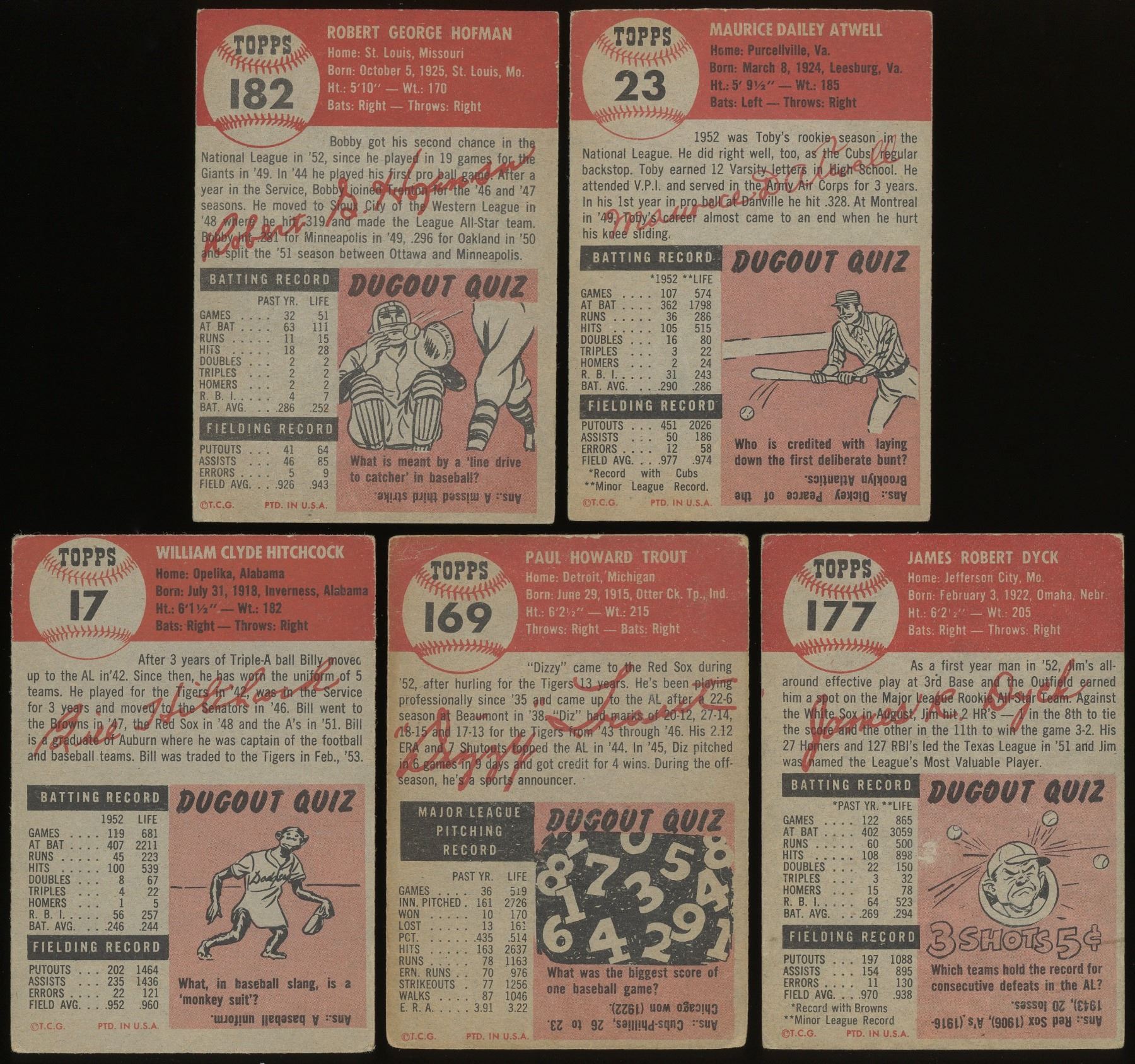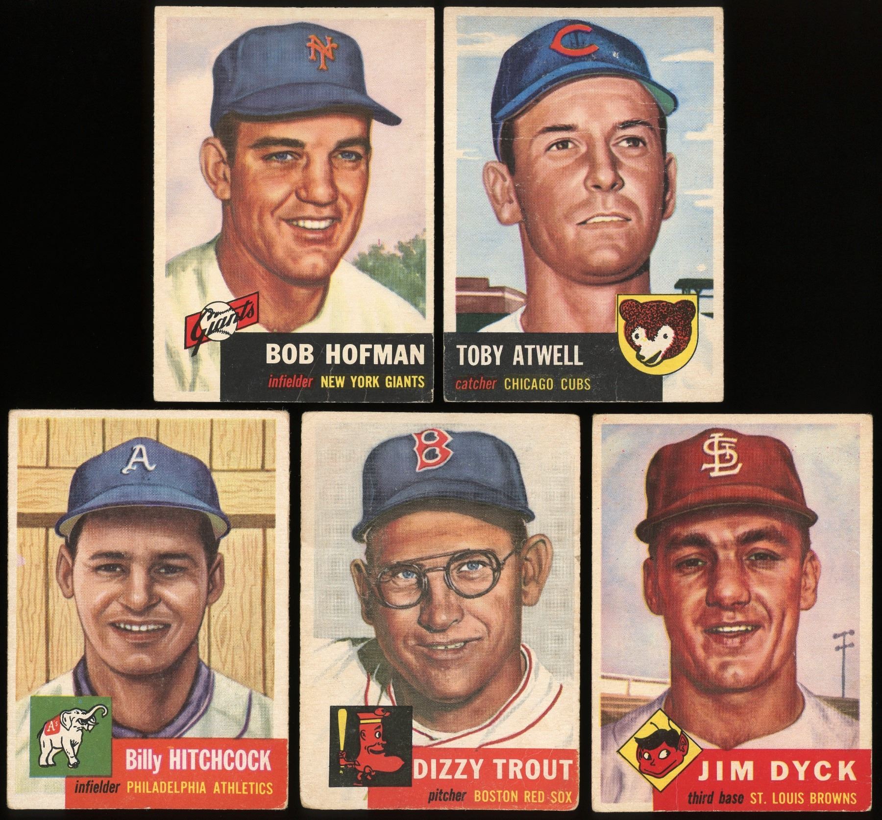 12 cards from the classic 1953 Topps set, grades GD to VG-EX (see scans). Includes: 8 VG+, 17 VG+, 23, 58, 71 VG-EX, 83, 169, 177 Dyck RC, 182, 201, 230, 238 Hogue RC. Beckett high value is $140.