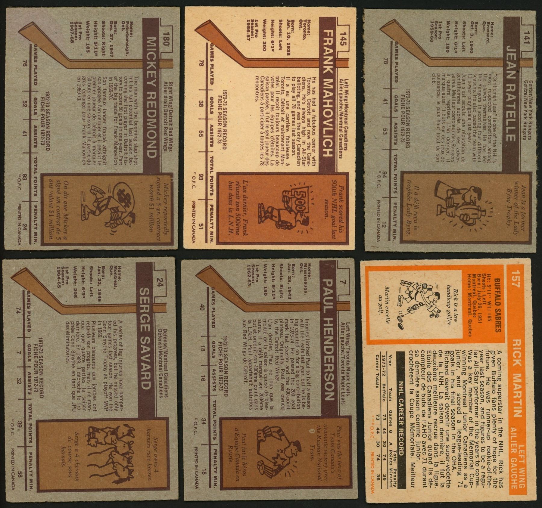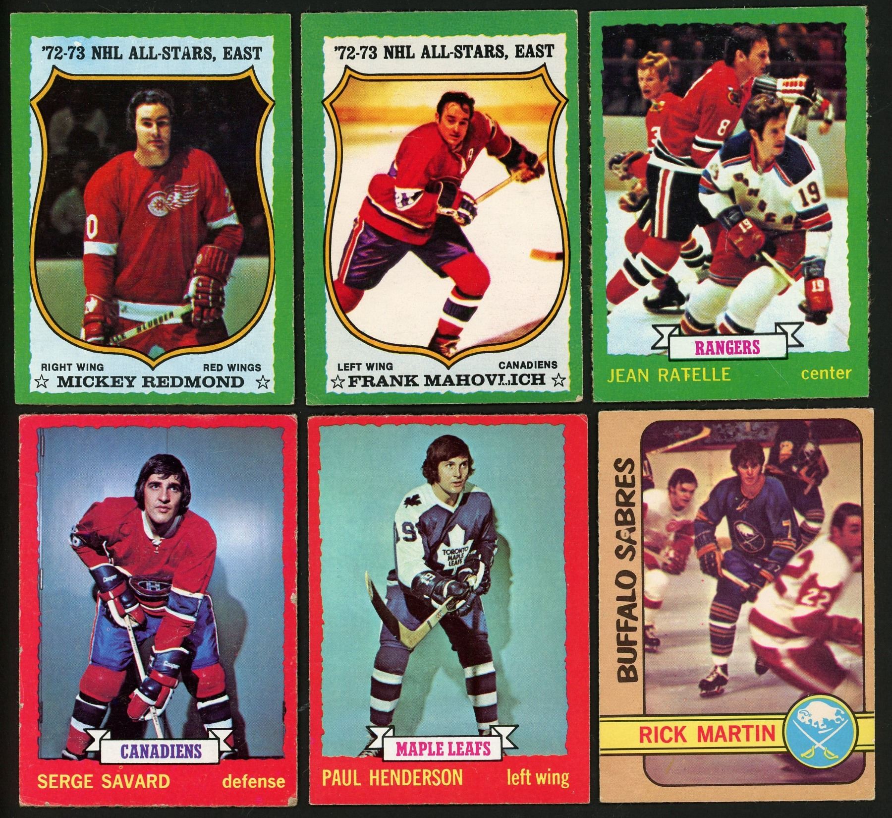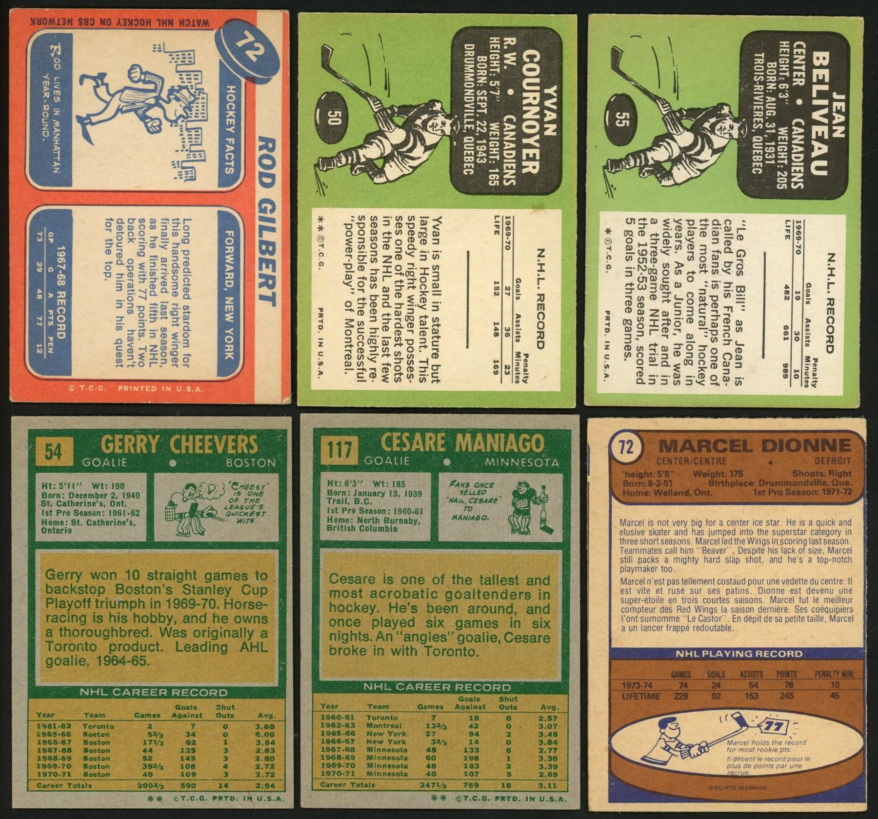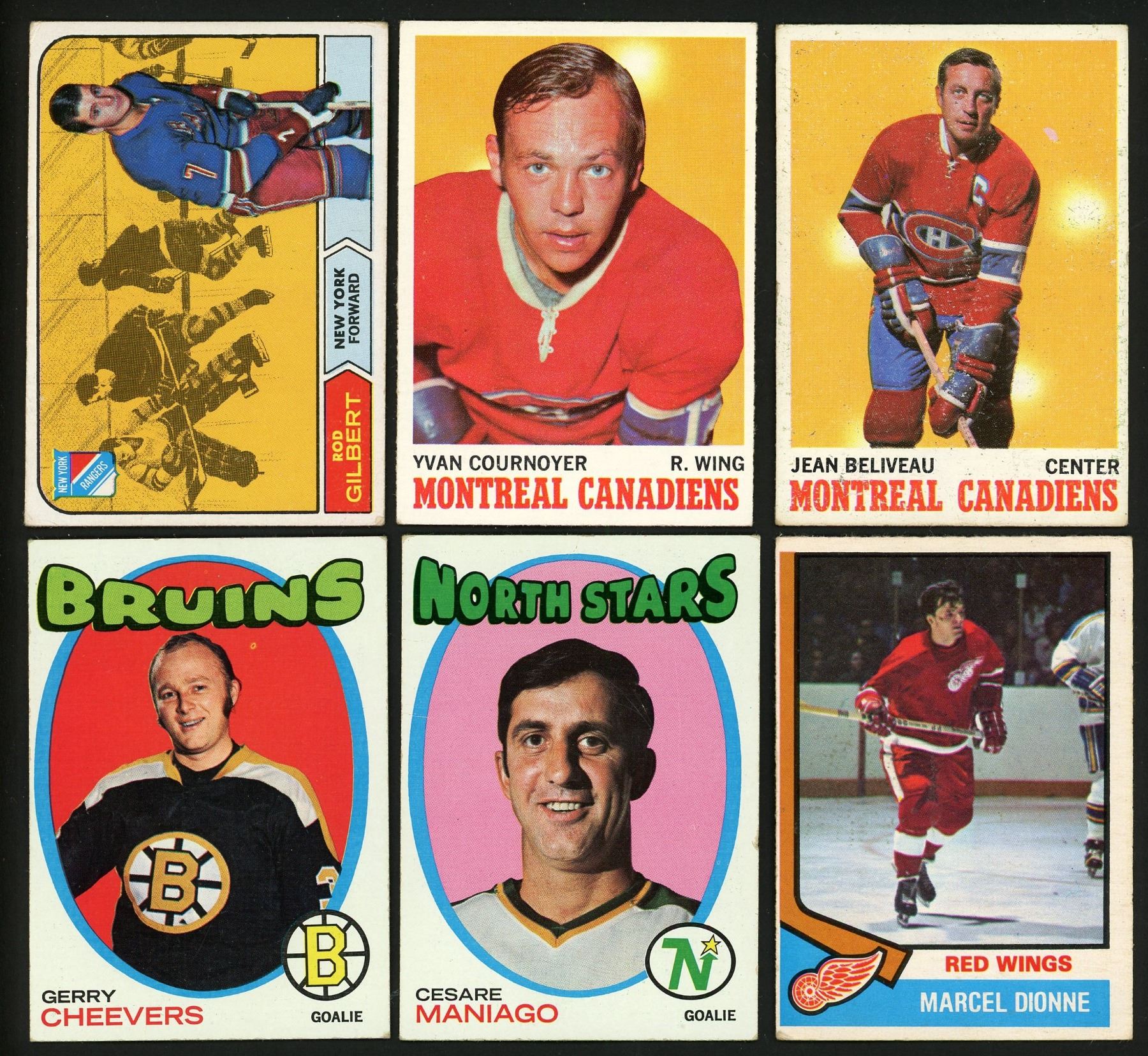 Mixed lot of stars and Hall of Famers from 1968-69 through 1974-75, Breakdown is as follows: 1968-69 Topps #72 Rod Gilbert* (VG-EX), 1970-71 Topps #50 Yvan Cournoyer (EX+), #55 Jean Beliveau* (VG), 1971-72 Topps #54 Gerry Cheevers* (EX), #117 Cesare Maniago (VG-EX), 1972-73 O-Pee-Chee #157 Rick Martin (VG), 1973-74 O-Pee-Chee #7 Paul Henderson (VG-EX), #24 Serge Savard* (VG), #141 Jean Ratelle* (EX), #145 Frank Mahovlich* (VG-EX), #180 Mickey Redmond (EX), 1974-75 O-Pee-Chee #72 Marcel Dionne* (VG). * denotes HOFers