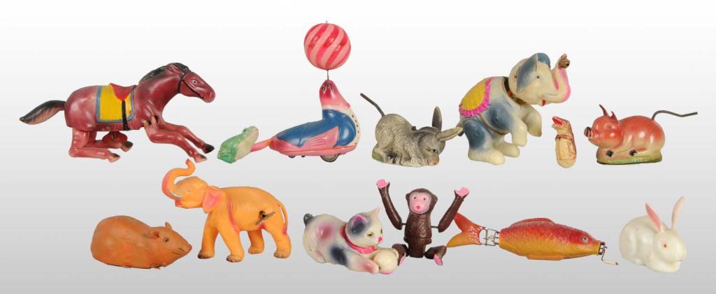 Description Japanese. Includes seven celluloid wind-up animals that are working, celluloid monkey, frog, and alligator bobbers, crank-operated fish, friction rabbit, and a composition mouse. Some are marked "Made in Japan" and some are marked "Made in Occupied Japan". Condition (Very Good - Excellent). Size Largest: 7" L.