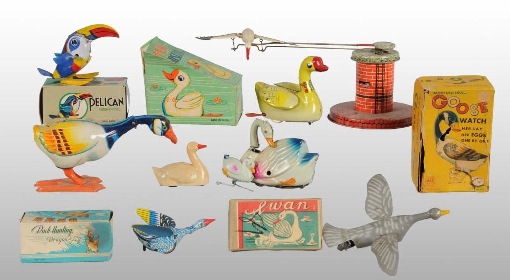 Description German, Japanese, Chinese, and Korean. Working. Most toys are tin wind-up. Includes eight original boxes and one with original packaging. Not all pictured. Condition (Very Good - Excellent). Size Largest: 9" L.