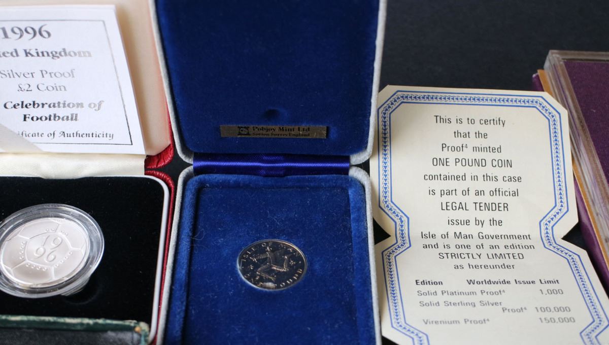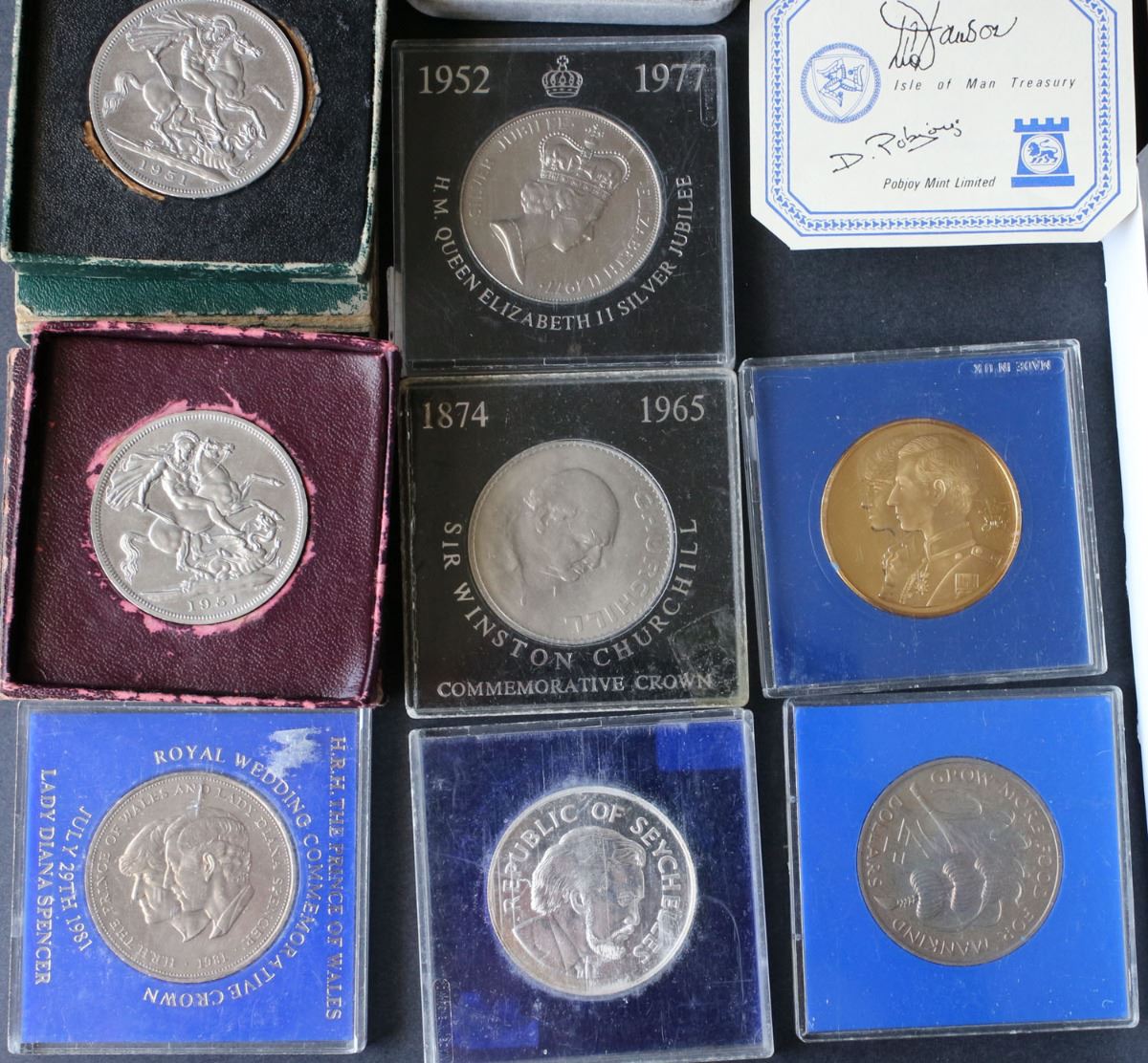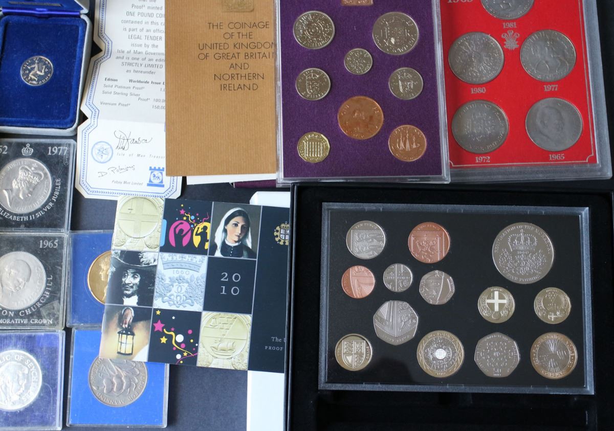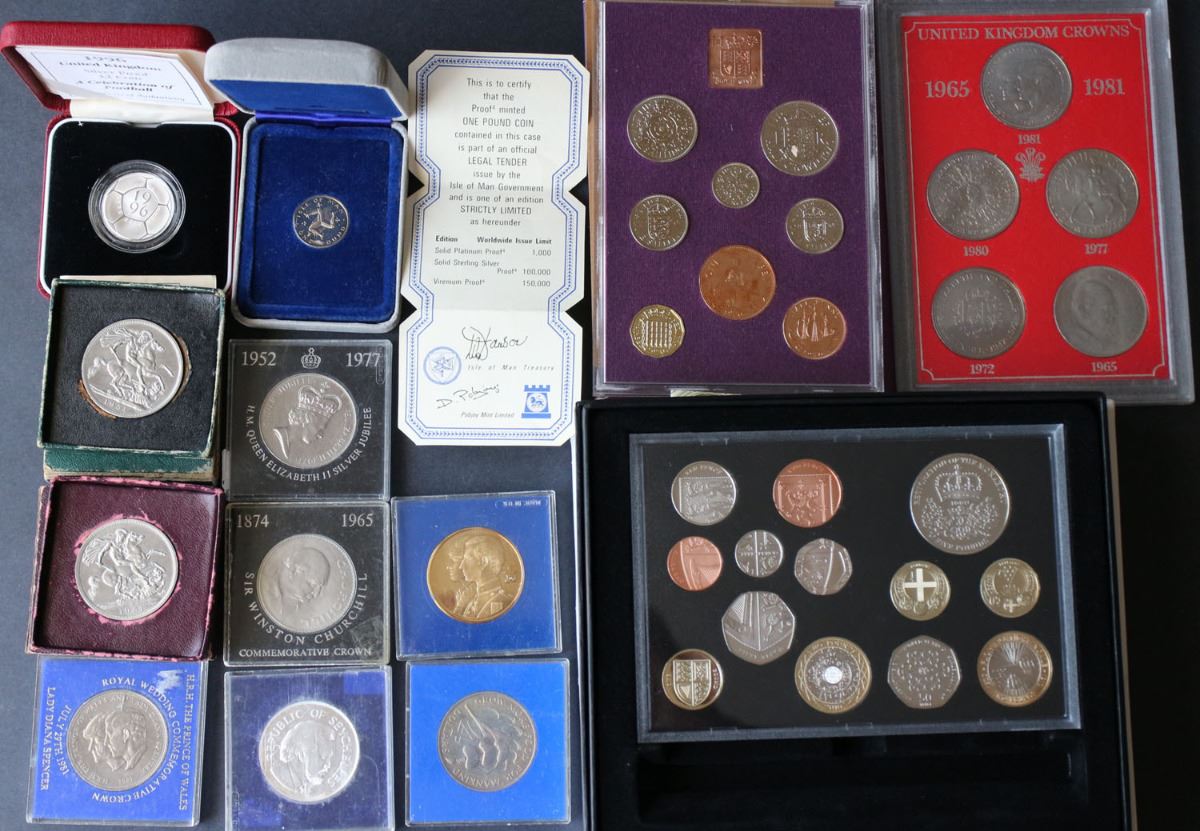 Lot of 13: Coinage of Great Britain and Northern Ireland 1970 8-coin Proof set (UK adopted a decimal system in Feb. 1971); UK 2010 13-coin Proof set (includes 2 Bimetallic coins); 1965-1981 UK 5-Crown set; 1996 UK Sterling Silver Proof Two Pound Coin Celebration of Football; Isle of Man Sterling Silver One Pound Proof (Pobjoy Mint); 1951 Festival of Britain (green) Silver Crown; 1951 Festival of Britain (red) Silver Crown; 1965 Churchill Crown; 1970 Barbados Four Dollar; 1977 Sterling Silver Seychelles 25 Rupees; 1977 QEII Silver Jubilee / British Petroleum; 1981 Prince of Wales / Lady Spencer; Prince of Wales / Lady Spencer Wedding / St. Paul's Cathedral 22kt Gold-Plated Medallion