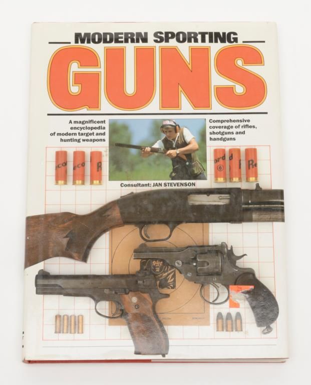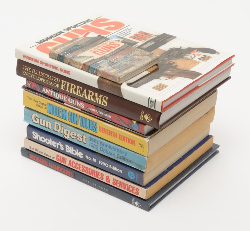 Lot of 13 misc. gun-related reference books including “Modern Handguns” by Adam, “The Illustrated Encyclopedia of Firearms” by Hogg, “Modern Sporting Guns” by Stevenson, etc. Est.: $50-$100.