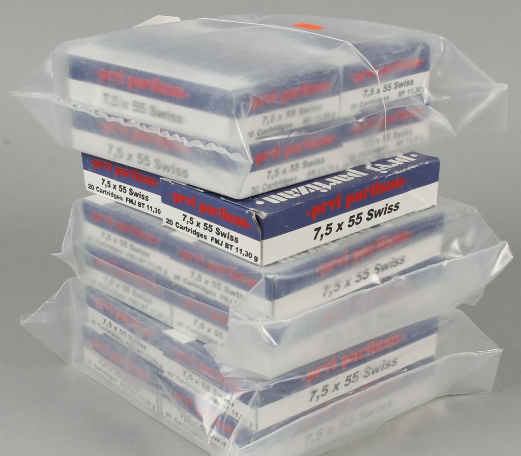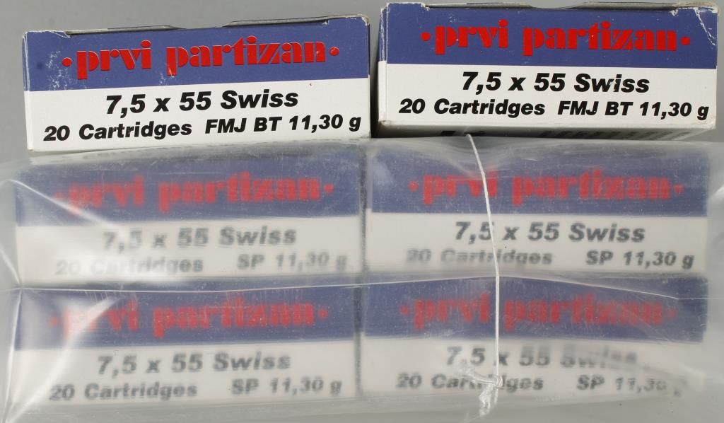 4 Boxes 7,5 X 55 Swiss 20 cartridges SP 11,30 g. 10 Boxes 7,5 X 55 Swiss 20 cartridges FMJ BT 174 gr.