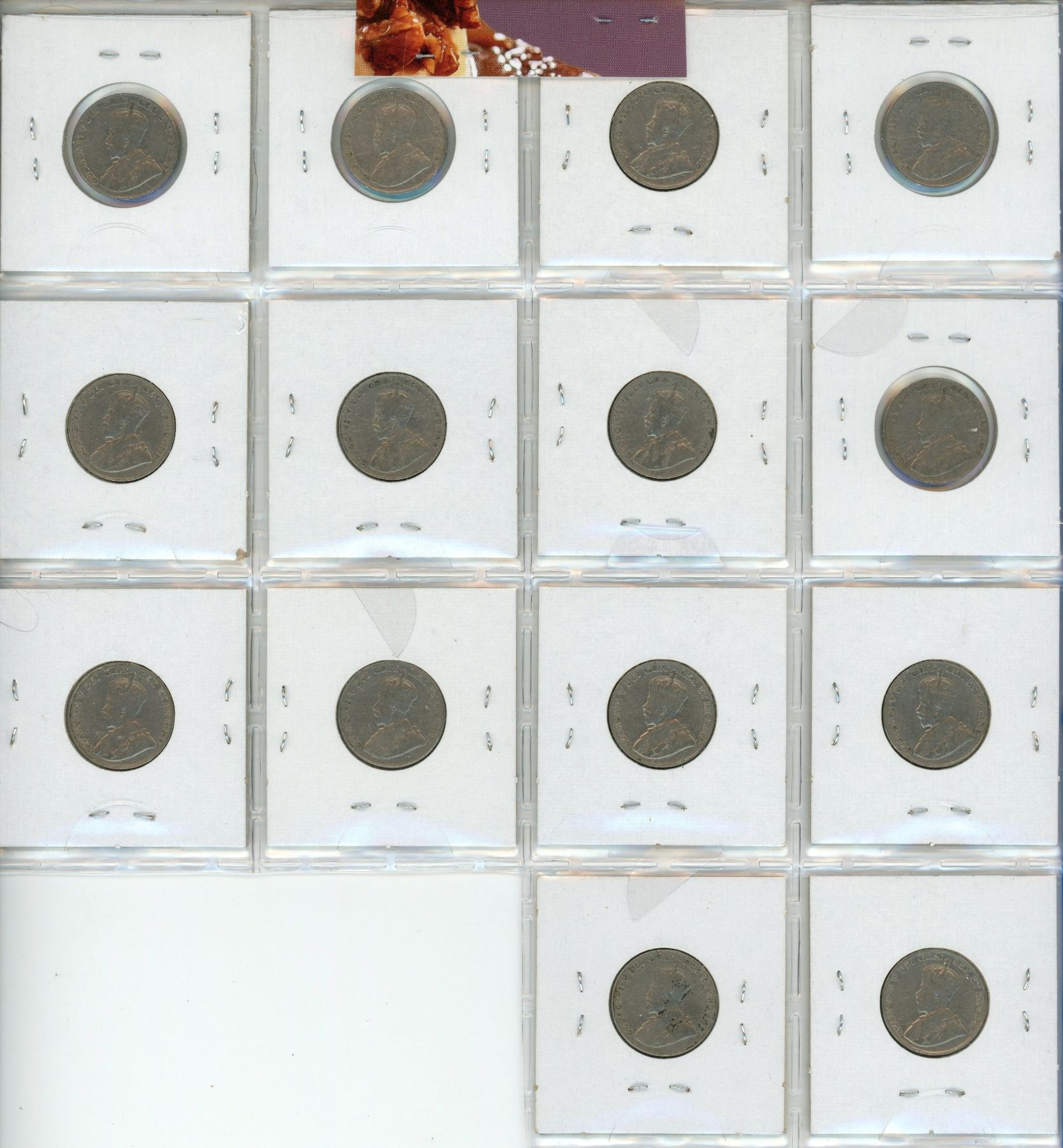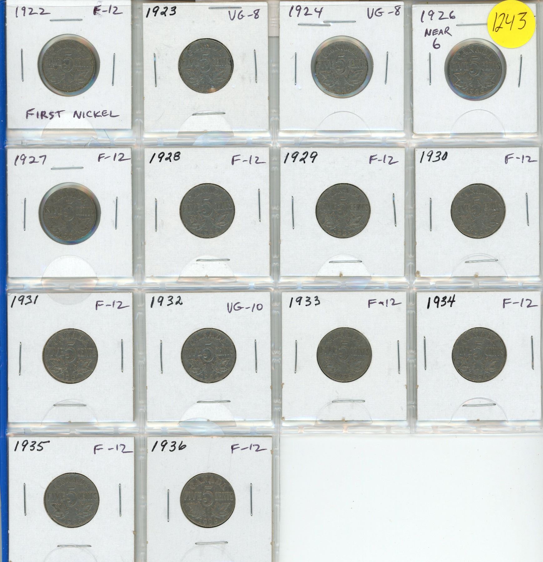 Lot of 14 Canadian George V Nickels 1922 to 1936. Missing only Scarce 1925. Coins grade VG-8 to F-12.