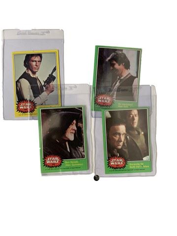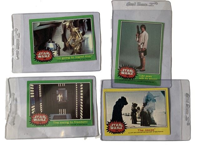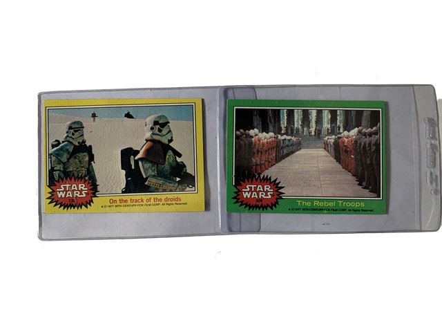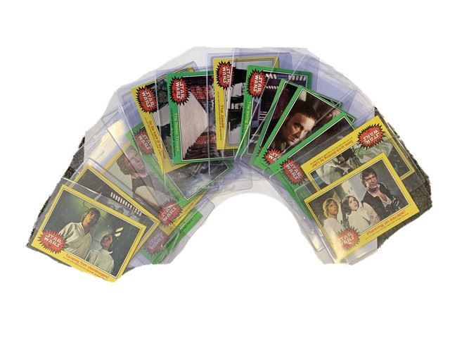 Lot of 14 Star Wars 1977 20th Century Fox Film Corp trading cards. Cards include Storm Troopers, R2-D2, C3PO, Princess Leia, Han Solo, Luke Skywalker, Obi Wan Kenobi, the Jawas, and Rebel Troops. Each card has been preserved in its own plastic case.