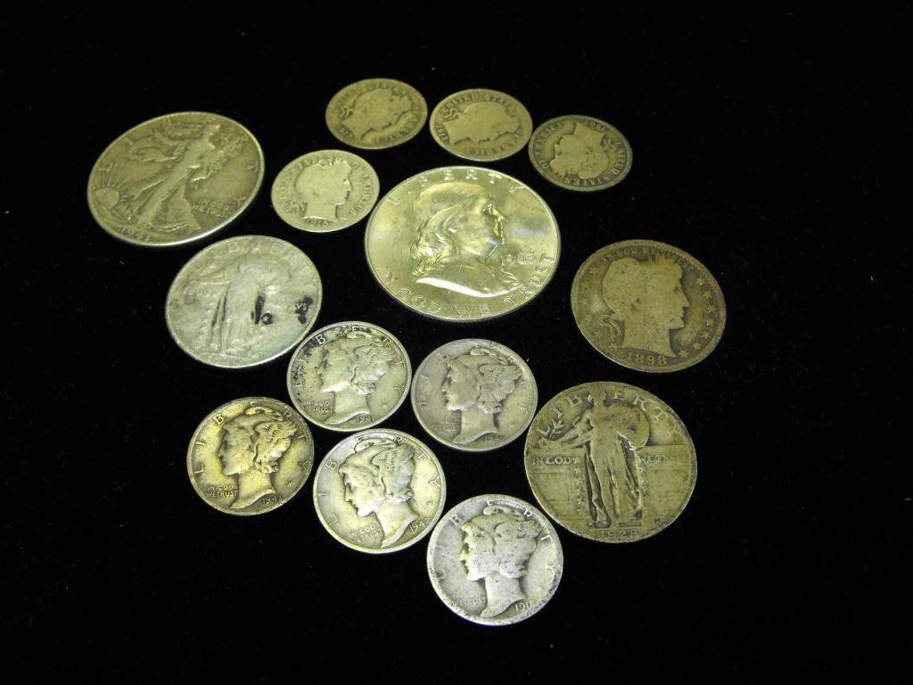 (2) 90% Halves- 1 WL-1 Franklin- (3) 90% Quarters- 2 SL- 1 Barber- (9) 90% DImes- 4 Barber-5 Mercury- Coin dates will vary- You will receive the total coins you see in the picture. They may be different dates and grades.