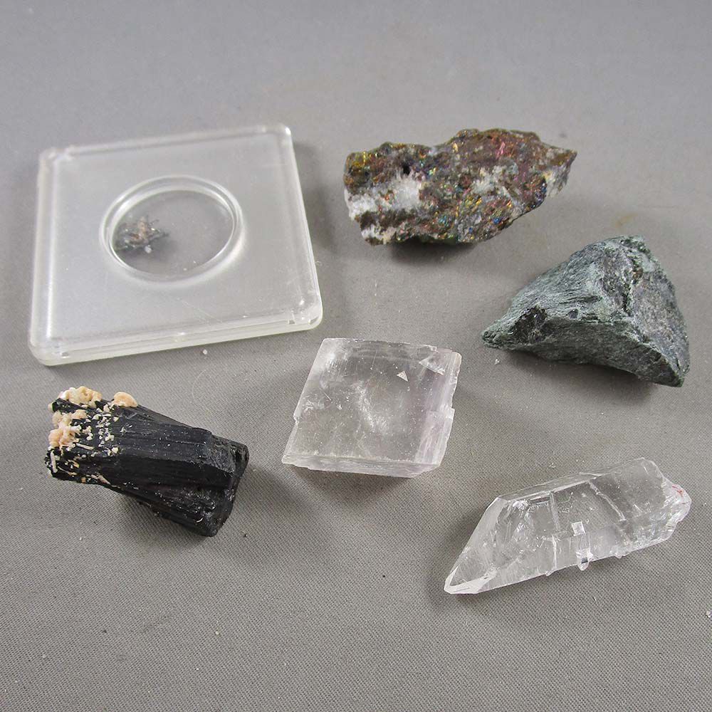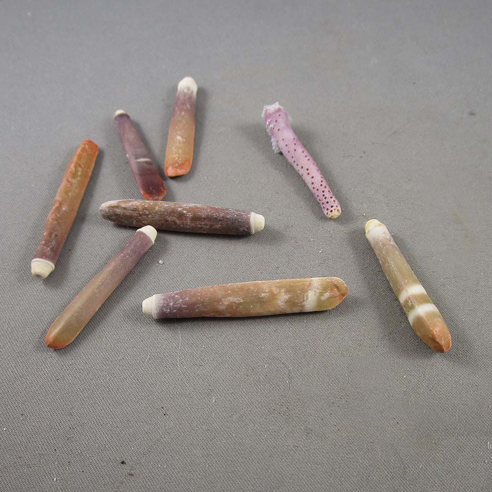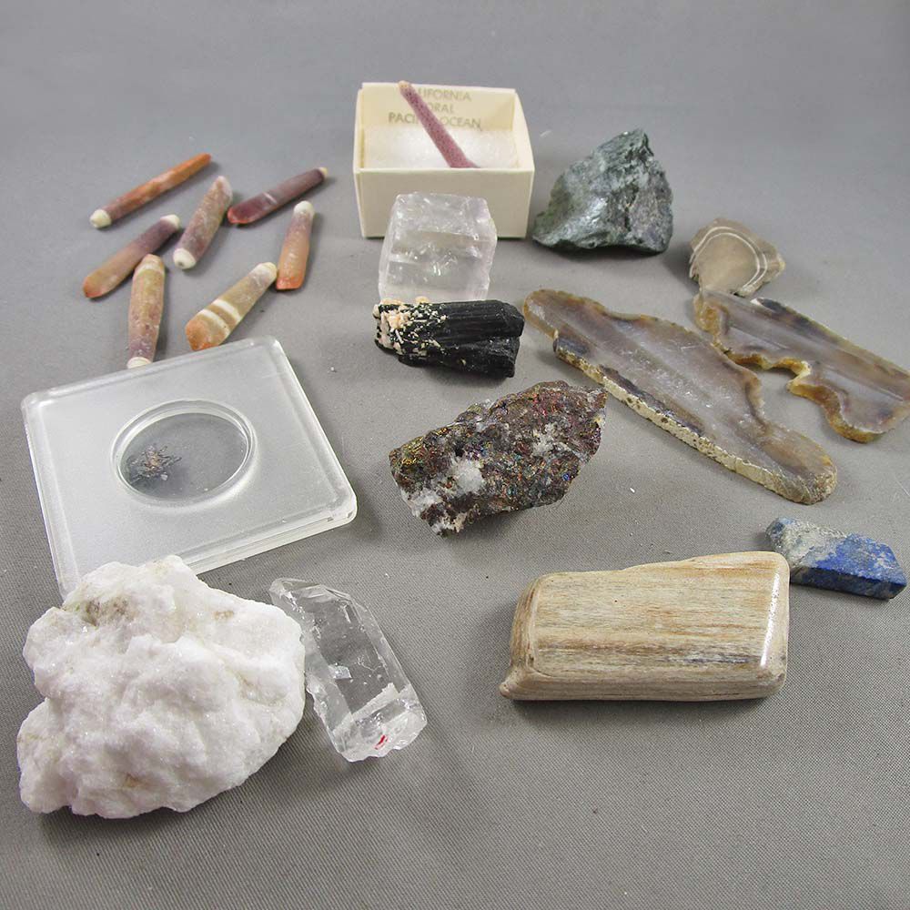 Optical Calcite, Agate, Coral, Sea Urchin Spines, Petrified Wood, Lapis Lazuli, Black Tourmaline, Peacock Ore and others