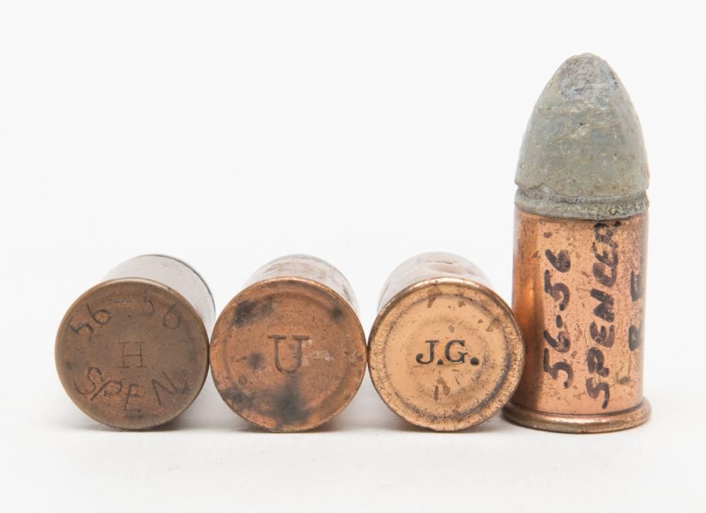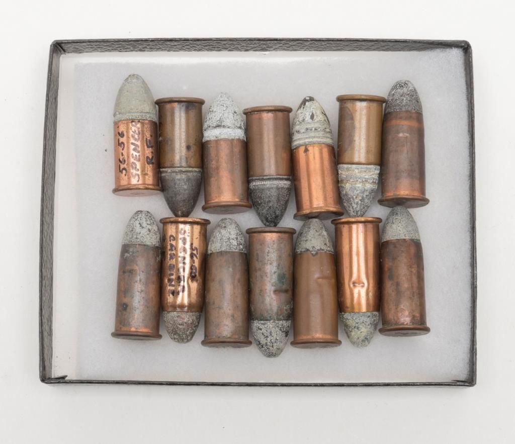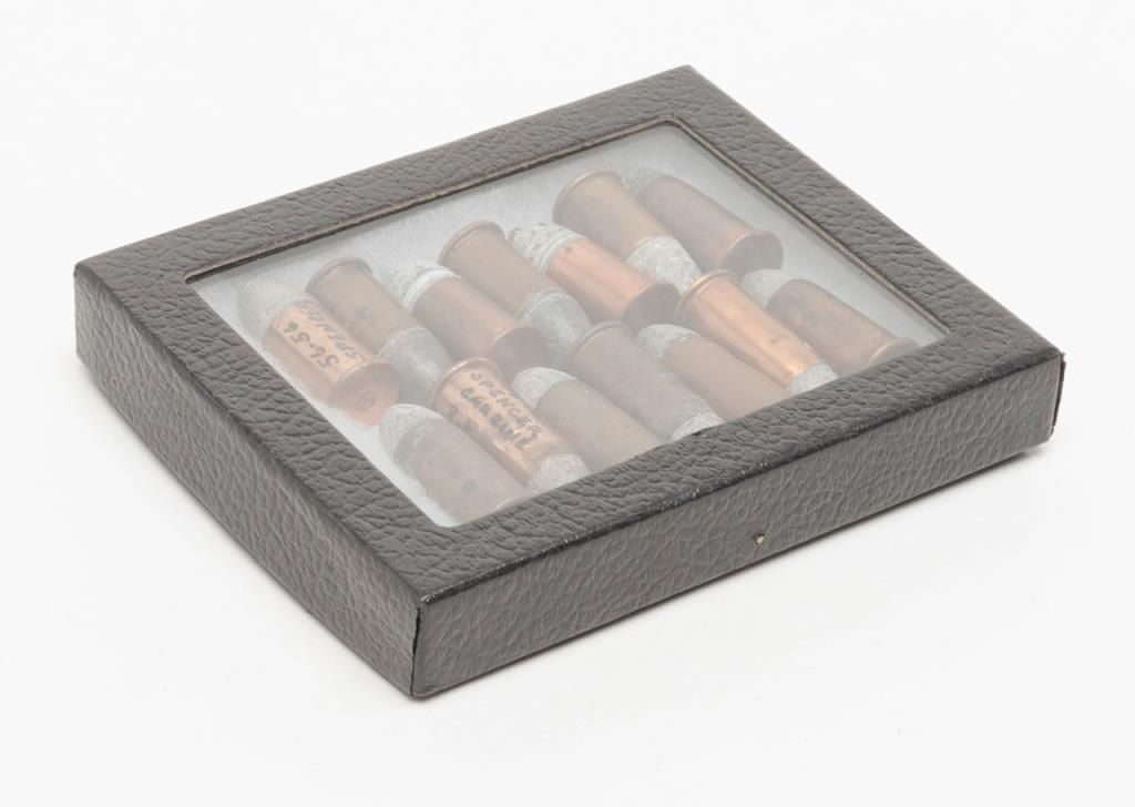 Lot of 14 authentic Civil War-era .56-56 cal. cartridges for the Spencer Repeating rifle in Riker case; from a well-known local collector. Est.: $90-$180.