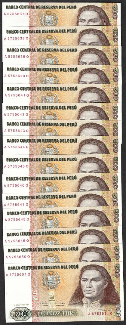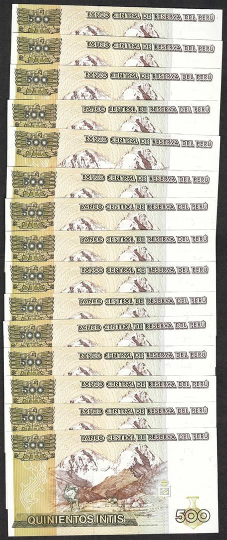 One Lot of (15) 1987 Peru Quinientos Intis Uncirculated Bank Notes.