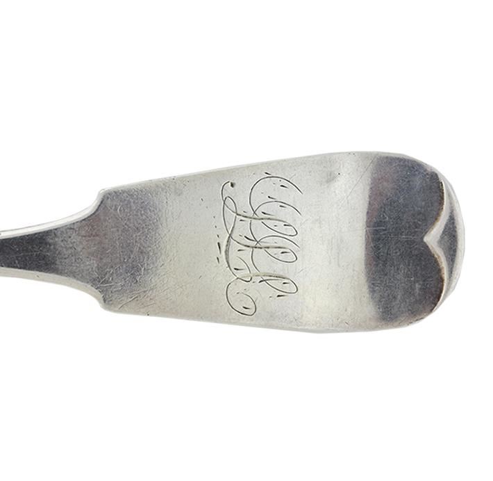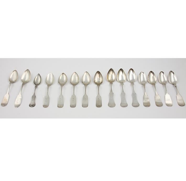 One lot of 15 American coin silver spoons in the fiddle pattern circa 1800's. Lot includes: (4) H.N Walter 1833 NY spoons engraved monogram, (1) WM L. Pitkim 1825 CT spoon engraved monogram, (3) HR Holman 1830 spoons engraved initials, (1) L. Kent 1825 OH Spoon engraved initials, (4) Samuel A. Mansfield 1820 PA spoons engraved monogram, (1) Platt Brothers 1816 NY spoon engraved monogram, (1) Harris and Stanwood Boston MA 1825 spoon engraved initial.