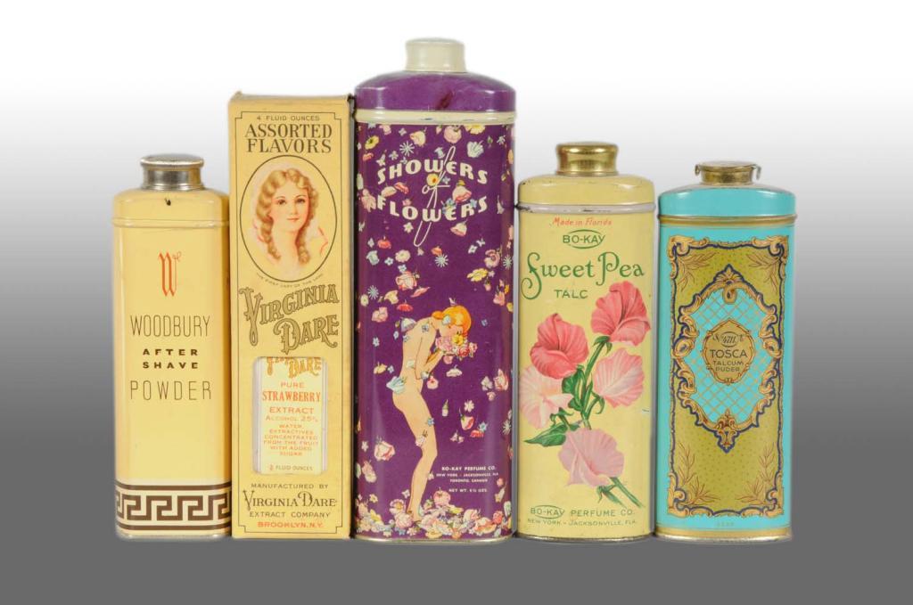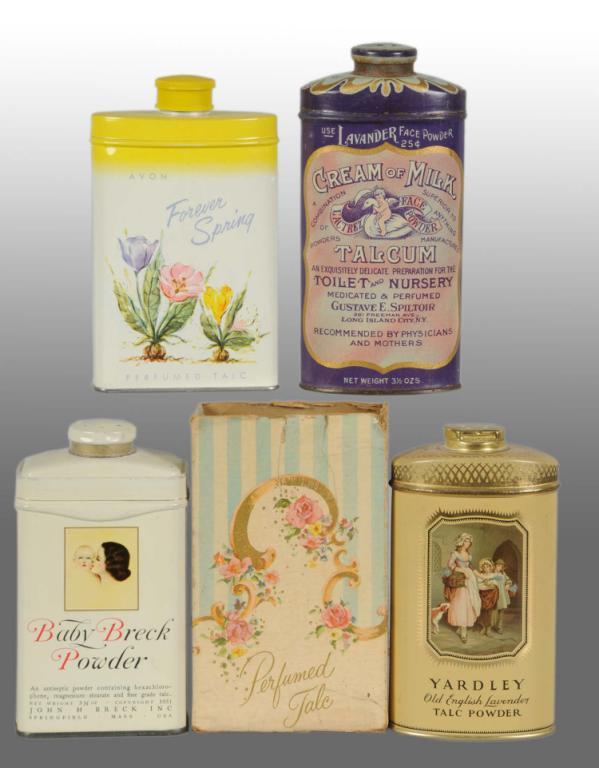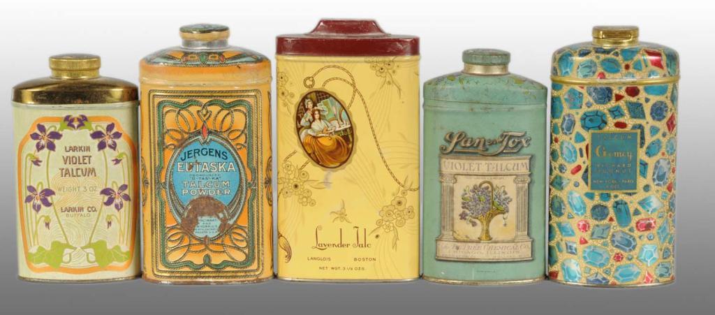 Includes Larkin Violet, Yardley, Cream of Milk, San-Tox, and Sweet Pea talcum. Nice grouping in good condition overall. Some still full of powder. Condition (8.0 - 8.8, Excellent). Size Largest: 8 - 1/2" T.