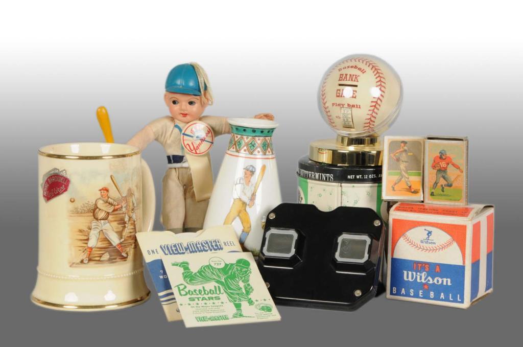 Includes early ceramic vase with baseball player on it, Royal Bradwell artwork mug with baseball catcher and batter made in England, Swiss peppermint tin, baseball bank, two cardboard games, two small celluloid baseball players, View Master with 1950s and 1960s baseball star reels, pair of binoculars with "Dodger National League Championship" button attached, Wilson Prep League baseball with original box and six packs of Ohio Blue Tip matches, including two that look like Ted Williams. Nice and interesting lot with many items. Condition (Very Good). Size Average: 6" T.