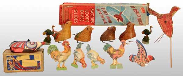 Description American and Chinese. Includes Irwin Flying bird in original box, four wind-up roosters, one fish dexterity game, and various other cardboard animals. One Original Cardboard Stand has been ADDDED to this lot. Condition (Very Good). Size Largest: 14" L.