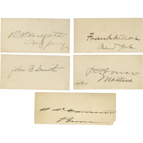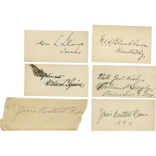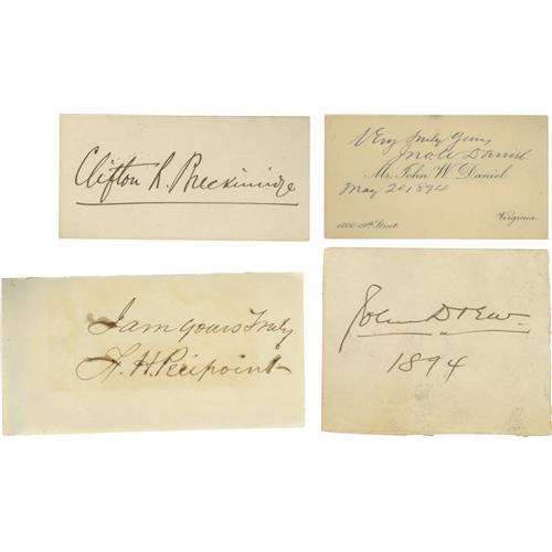 <B>Lot of Fifteen Autographs of 19th Century American Politicians and Performers,</B></I> including:<BR> <B>Frank Harris Hitchcock</B></I> - (1867-1935), chairman of the Republican National Committee and postmaster general;<BR> <B>Francis H. Peirpoint</B></I> - provisional governor of Virginia (June 1861 to April, 1863);<BR> <B>John Drew, Jr.</B></I> - (1853-1927) actor noted for Shakespearian comedy, society drama, and light comedies;<BR> <B>Clifton Rodes Breckinridge</B></I> - Member of Congress from Arkansas and minister to Russia;<BR> <B>John Warwick Daniel</B></I> - Member of Congress and senator from Virginia, known as "The Lame Lion of Lynchburg" due to a Civil War wound;<BR> <B>Jessie Bartlett Davis</B></I> - (1859-1905) performer, known for her singing in revivals, musicals, comedies, and operetta;<BR> <B>Watson Carvosso Squire</B></I> - senator from Washington and governor of the Territory of Washington;<BR> <B>William M Singerly</B></I> - Democratic candidate for governor of Pennsylvania in 1894; George Laird Shoup - senator from Idaho and the state's first governor;<BR> <B>Joseph Clay Stiles Blackburn</B></I> - (1838 - 1918) Member of Congress and senator from Kentucky; and, five others.<BR> Most on cards. <BR><BR><b>Shipping:</b> Flat Material, Small (<a target="_blank" href="http://www.heritageauctions.com/common/shipping.php">view shipping information</a>)