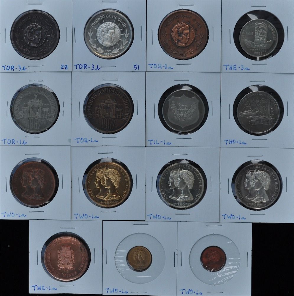 Lot of 15 Centennial Medals - Includes: Thetford Mines 2 diff. (THE-1a, 3a), Thompson Nickel Mine (THO-1a), Tillsonburg (TIL-1a), CNE Set of two (TOR-1a, b), Three Toronto Coin Club (TOR-3a, 3b X 2), Six Victoria/Elizabeth (TWO-1a X 4, 1c X 2). 15 Pcs.