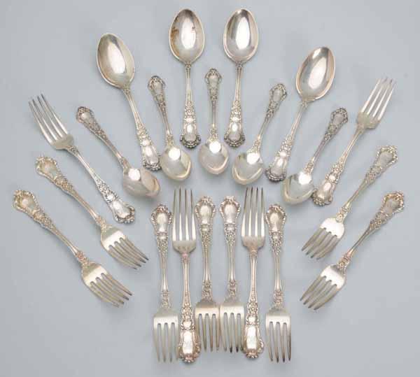 Description Weighs 30 troy ounces. All in the Old Baronial pattern. Lot includes four dessert spoons, five teaspoons, and twelve dessert or lunch forks. Condition (Very Good). Size Forks: 7" L.