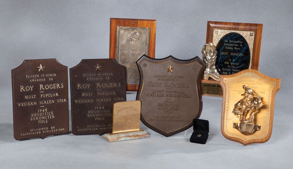 Lot of 15 Roy Rogers Awards and Plaques. Nine (9) Entertainment Awards celebrating the career of Roy Rogers:. a) Golden Boot Award, August 18, 1983;. b) 14K Grammy pin;. c) Foreign Press Association of Hollywood to Roy Rogers, Most Popular International Western Star 1952;. d)1995 National Cowboy Song & Poetry Hall of Fame plaque honoring Roy Rogers For outstanding contributions to Cowboy Music;. e) Screen Guide 1946 Award to Roy Rogers, Favorite Western Star;. f-h) Most Popular Western Screen Star 1944, 1945, 1946;. i) Screen Guide Magazine plaque 1944 Favorite Western Star. Six (6) Law Enforcement Plaques and Recognition Awards:. a) Department of Justice United States Marshals Posse centennial belt buckle;. b) a desk plaque from the United States Secret Service commemorating the 130th anniversary;. c) Honorary life membership presented to Roy Rogers by the Pennsylvania Rangers 9-15-71;. d) Belt buckle from the State of Oklahoma. e) Shield plaque with attached badge, Police Westminster, MD - Presented to Roy Rogers 1983;. f) Wooden plaque presentation from Dick Williams, San Bernardino, California. Provenance: Roy Rogers and Dale Evans Museum, Victorville, CA and Branson, MO;. to Christie's, July 2010; to present owner. Includes Certificate of Authenticity signed by Roy "Dusty" Rogers, Jr.