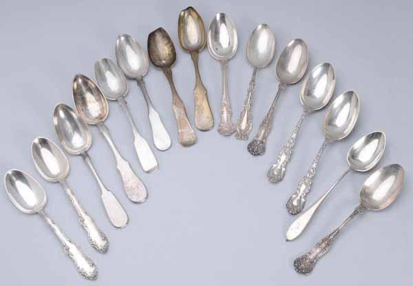 Description Weighs 33.5 troy ounces. Lot includes a pair of Gorham Imperial Chrysanthemum spoons, two Russian spoons, circa 1890s and made in Moscow, along with other European and American examples. Condition (Good). Size Largest: 8 - 1/2" L.