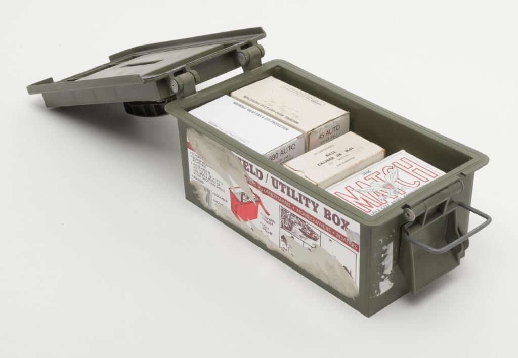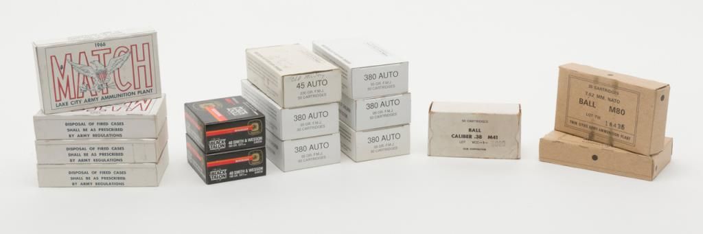 Lot of 15 boxes of ammo, some good collector, including 4 boxes of Lake City Army Ammo Plant 7.62mm NATO Match (1966); 2 boxes of Twin Cities Army Ammo Plant 7.62mm NATO M80 BALL; 1 box of .38 M41 Olin Corp. BALL; 5 boxes of MIWALL Corp. .380 ammo; 2 boxes of Winchester Supreme .40 S&W; and a partial box of misc. old military .45 ACP ammo with various headstamps; all contained in a green hard plastic military carry case. Est.: $150-$300