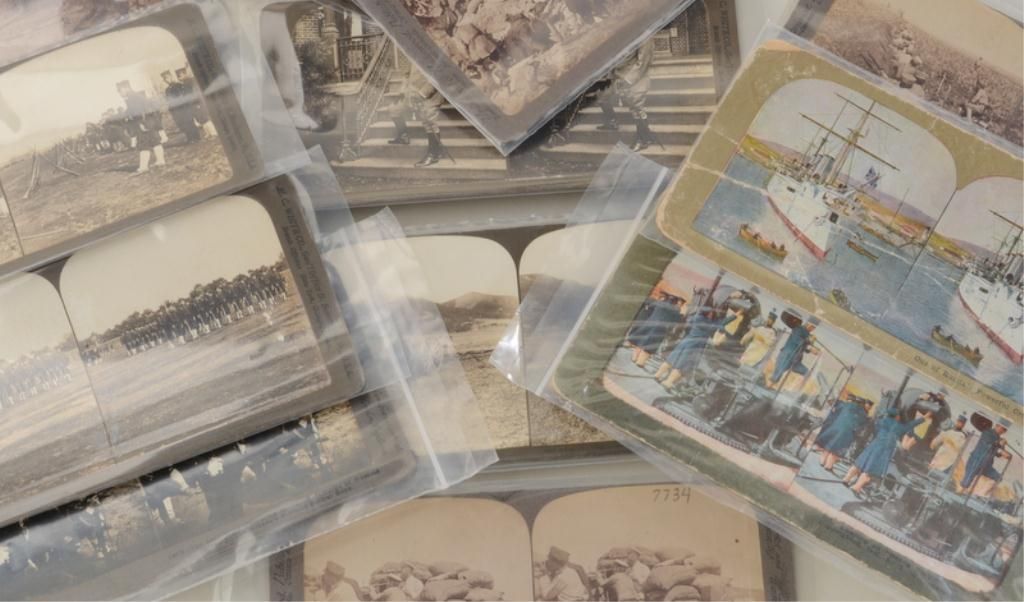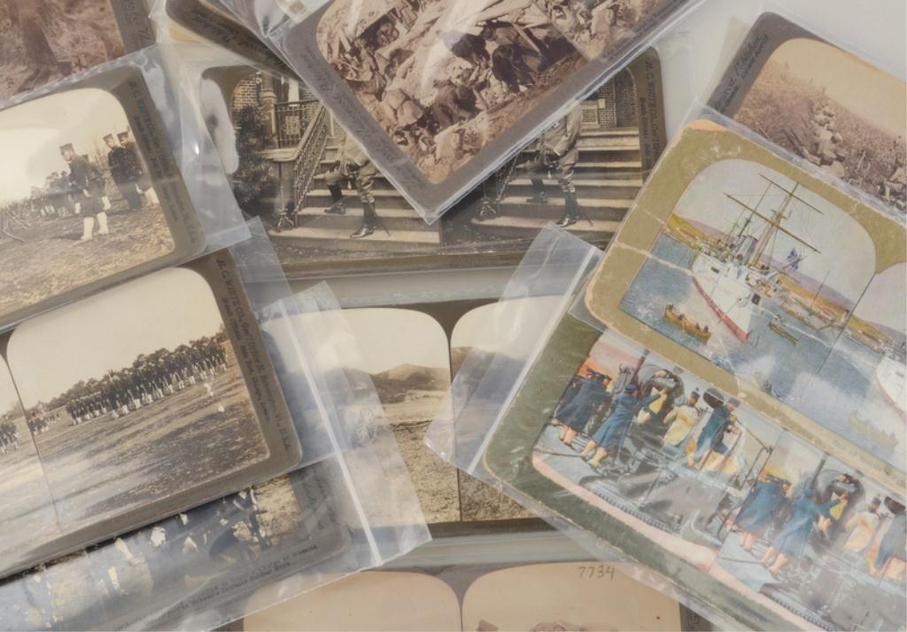Lot of 15 original stereoptic cards, circa 1903-05, depicting primarily military scenes of the Russian-Japanese War in China including the siege of Port Arthur and views of military weaponry of the battles; in goodto very good condition. Est.: $50-$75.