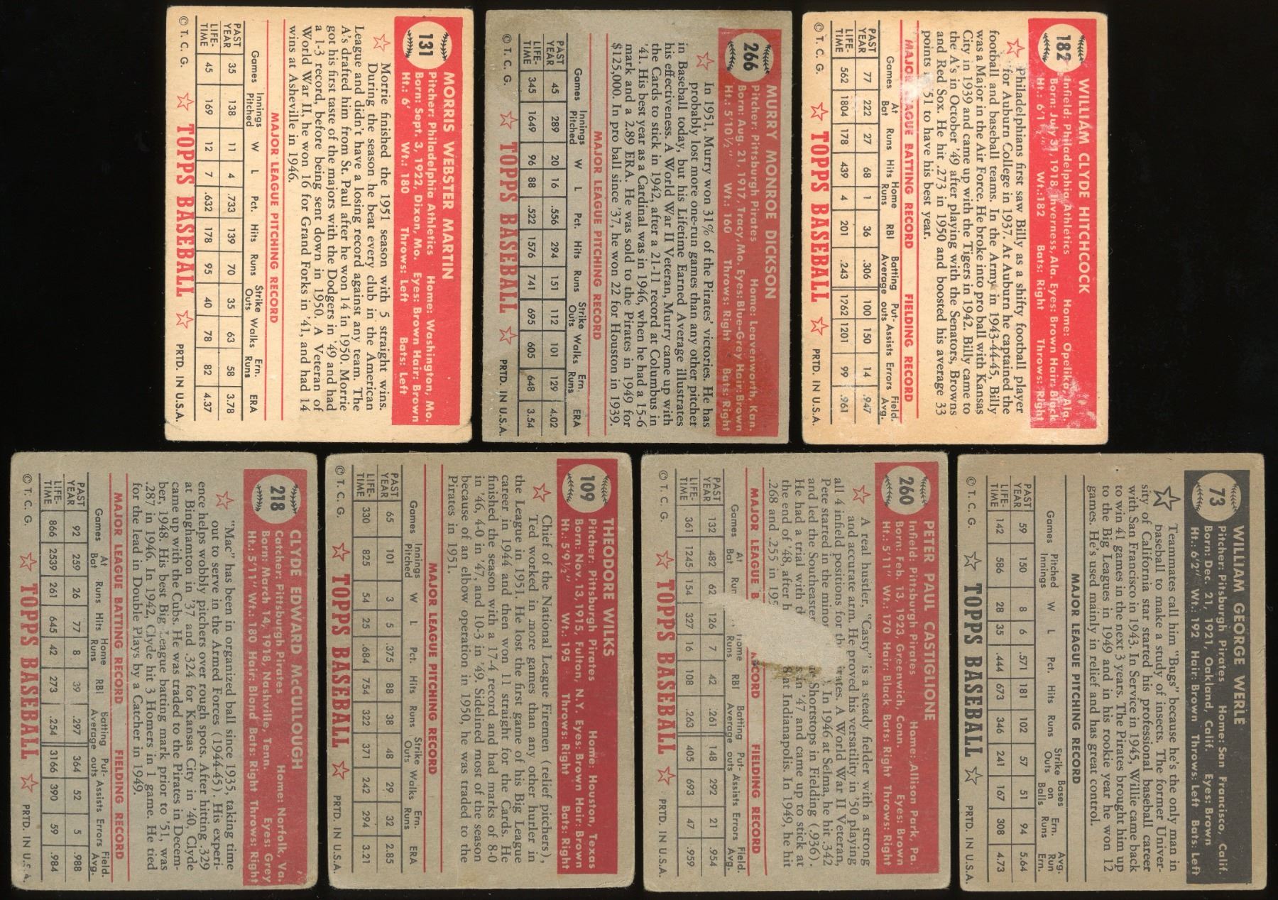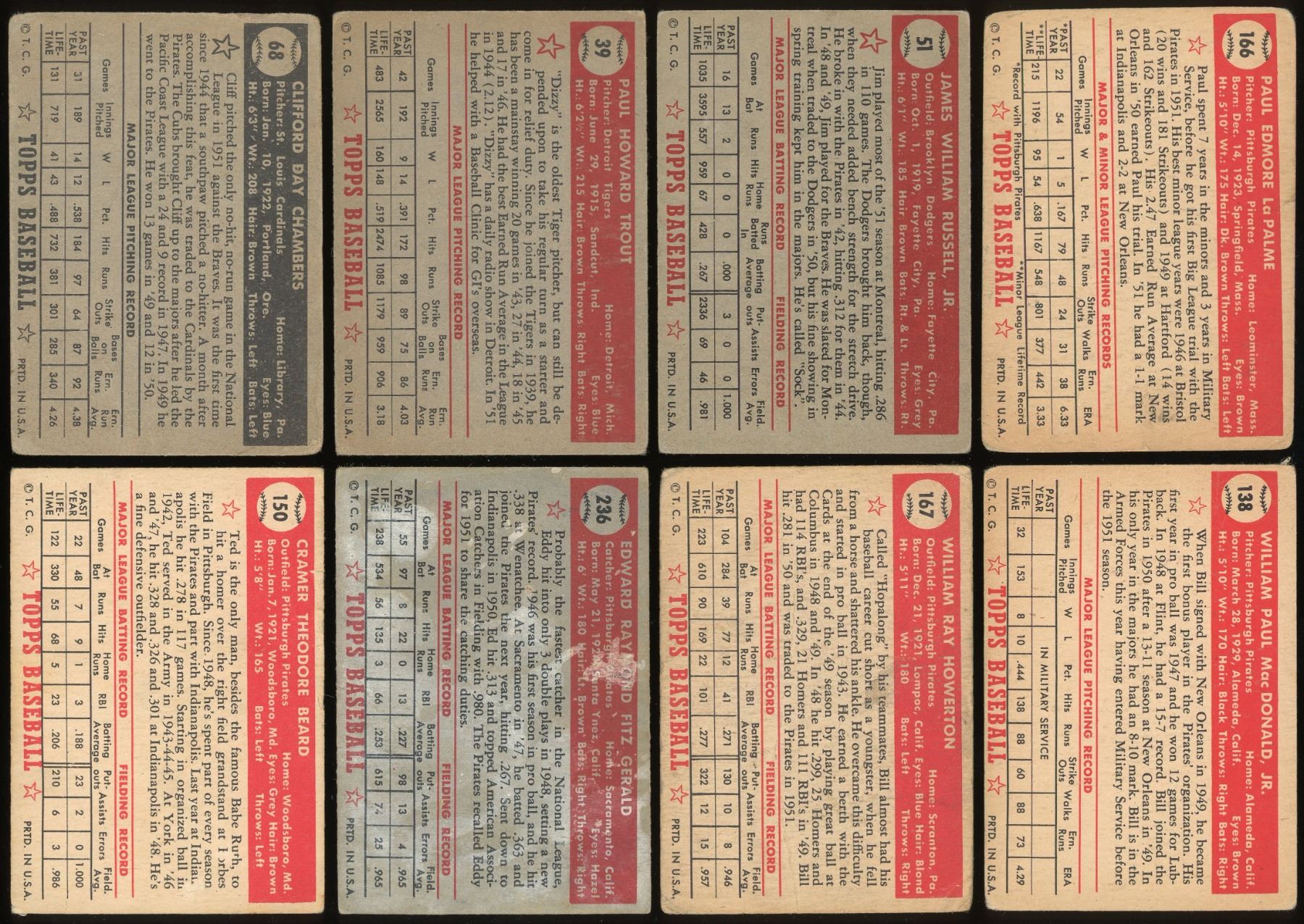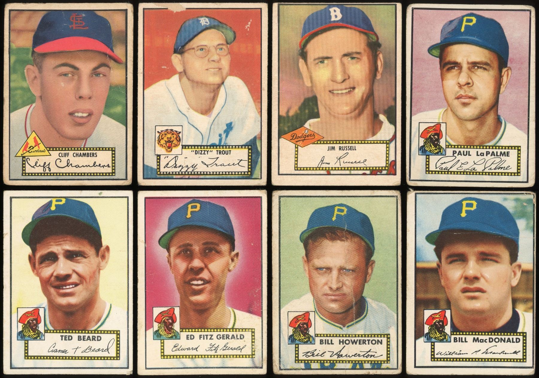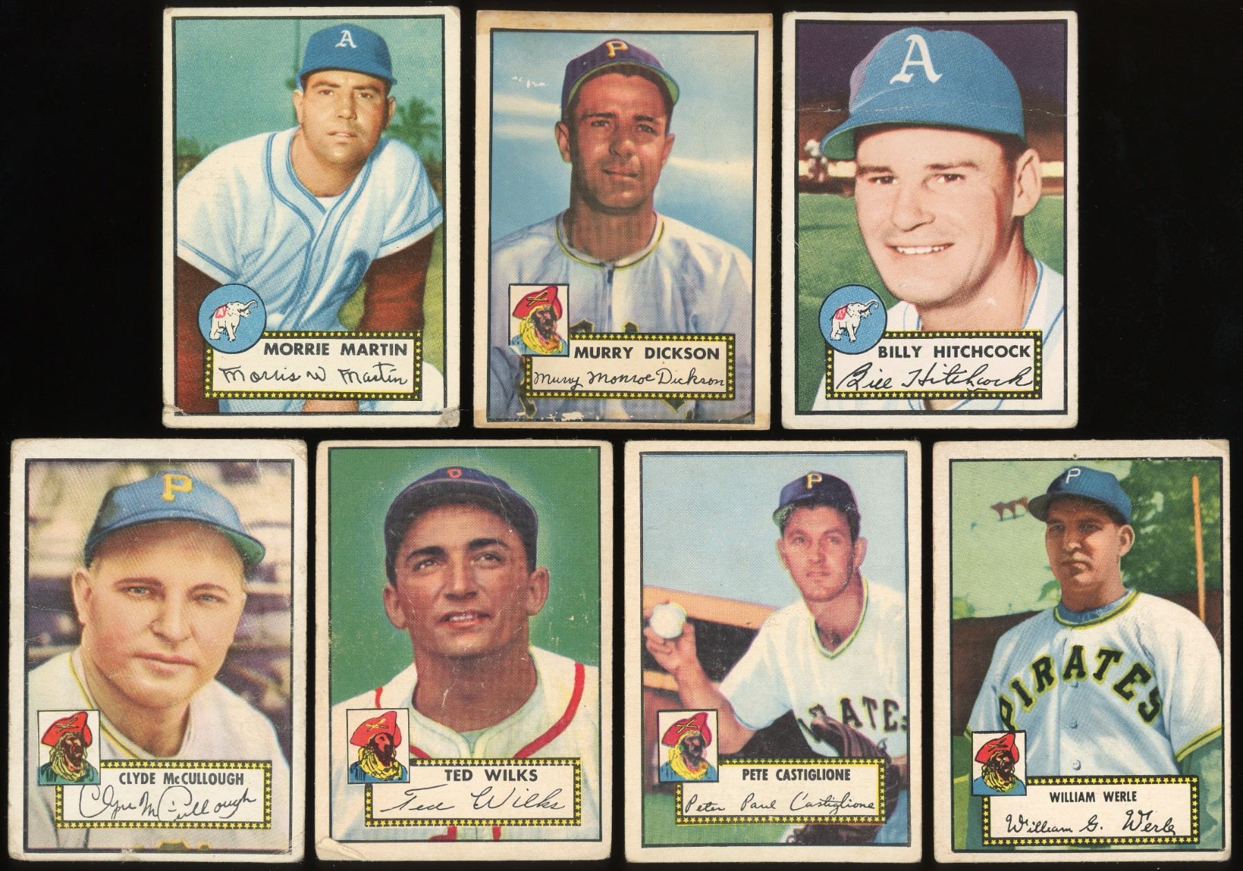 15 cards from the granddaddy of modern baseball card sets, the 1952 Topps offering, mostly off-grade (PR to GD), few better and loaded with Pirates (arrgh!). Includes: #39 Dizzy Trout, 51, 68, 73, 109, 131 Martin RC, 138, 150, 166 LaPalme RC, 167, 182, 218, 236, 260, 266. Becket high value over $80.