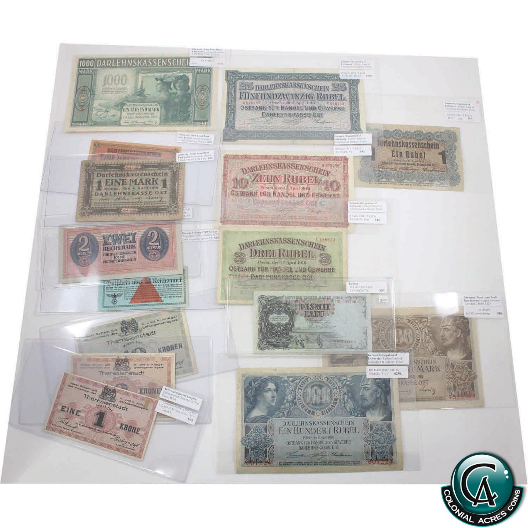 Lot of 15x German & Hungarian Military Money. Lot includes: German Military POW Camps "lagered" 2 Reichsmark WWII VF, 1942 WWII German Armed Forces Auxilary Payment Certificate EF, 3x German State Loan Bank East Kown note: 1918 100 Mark About VF, 1918 1 Mark Fine, 1918 1/2 Mark About VF, 1940 Latvia 10 Latu VF, 6x German Occupation of Lithuania: Eastern Bank of Commerce & Industry, Posen notes: 1918 1000 Mark Fine, 1916 25-Rubel VF, 1916 10 Rubel VF, 1916 1 Rubel F, 1916 3 Rubel Fine, 1916 100 Rubel F-VF and a set of 3x 1917 WWI Theresienstadt Prisoner of War Camp, Austro-Hungarian Empire 1, 2 & 10 Kronen notes. 15pcs total