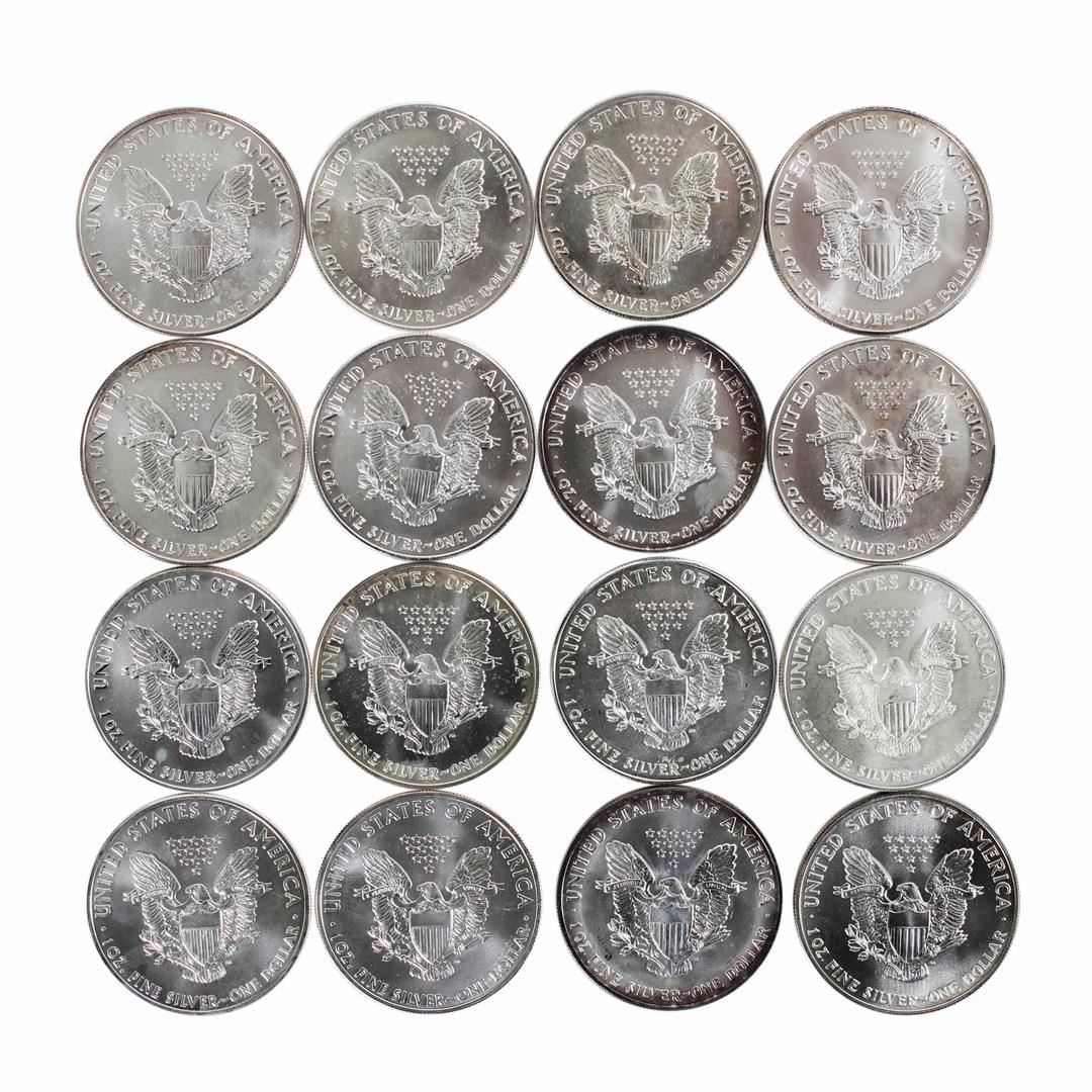 One Lot of (16) Brilliant Uncirculated Mixed Date $1 American Silver Eagle Coins.
