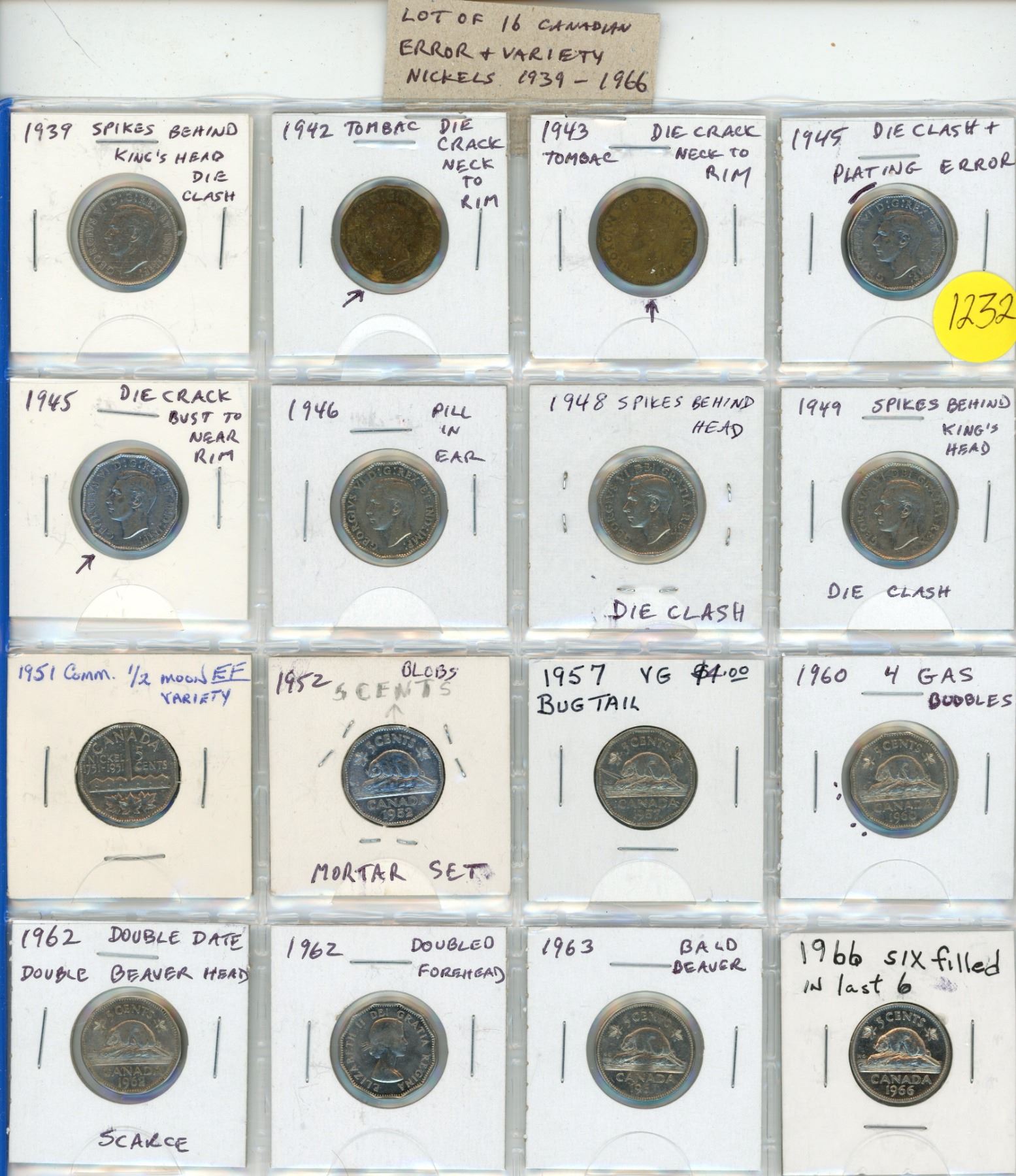 Lot of 16 Canadian Error & Variety Nickels 1939 to 1966. Includes Spikes behind King’s Head from Die Clashes, Die Cracks, Die Clash & Plating Error, Pill in Ear, Half Moon from Die Clash, Mortar Set, Bug Tail, Gas Bubbles, Doubled Beaver Head, Doubled Forehead, Bald Beaver & Filled 6. Rarely seen.