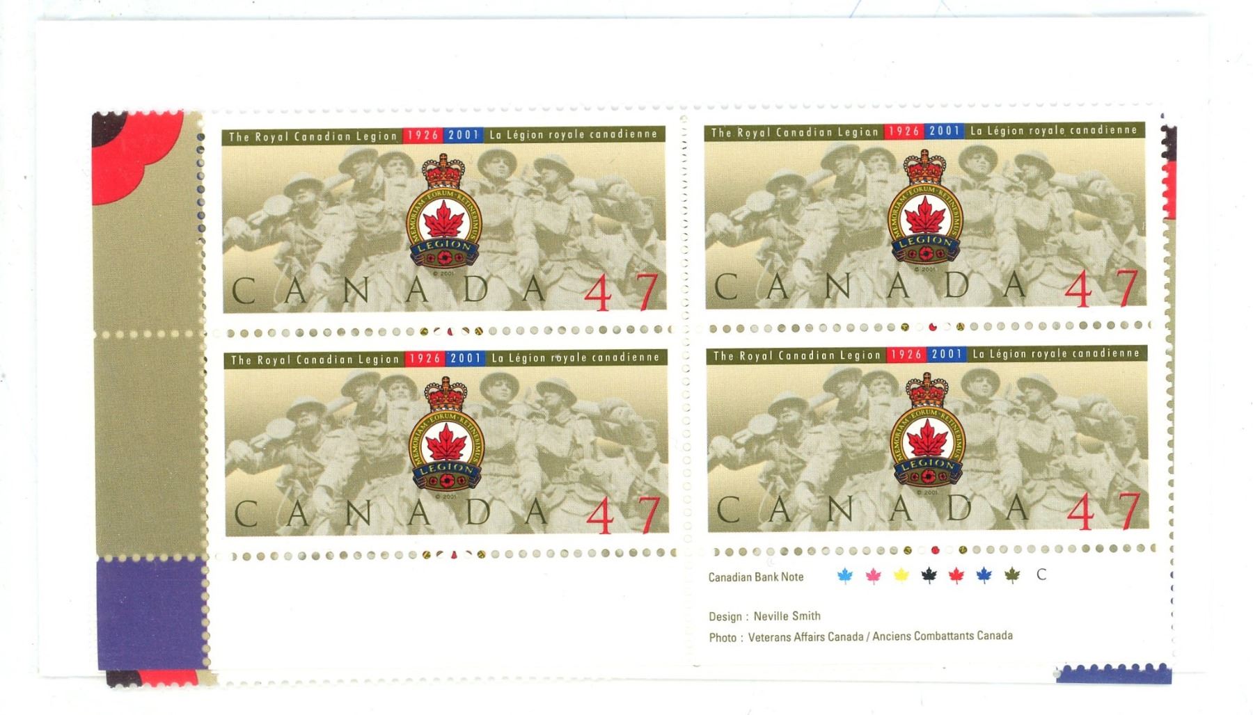 Lot of 16 Canadian Stamps that commemorate the Royal Canadian Legion. All are in Block of 4 with inscription corners. FV= $7.52. Mint.