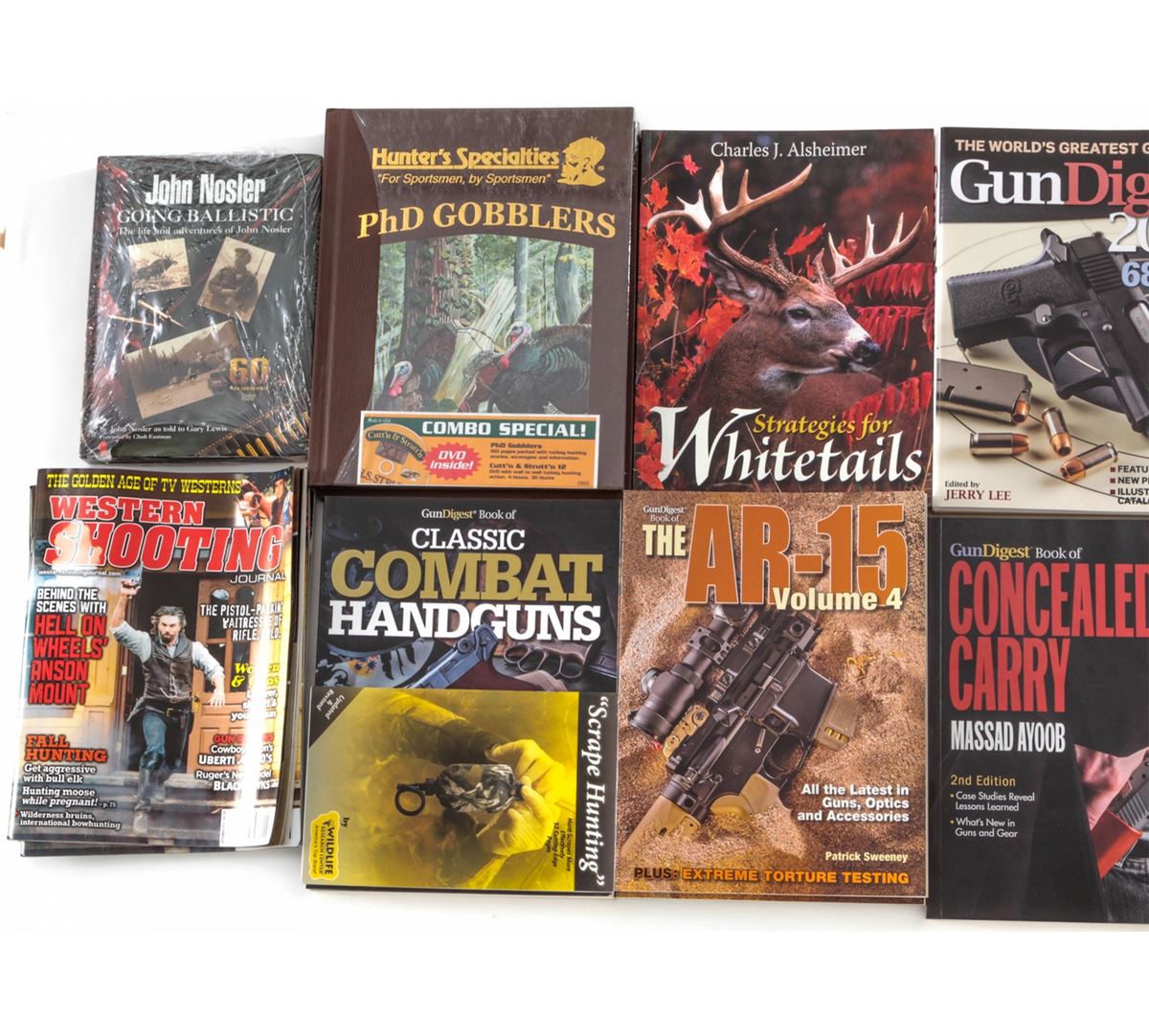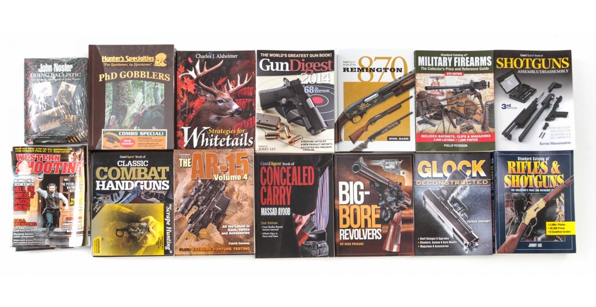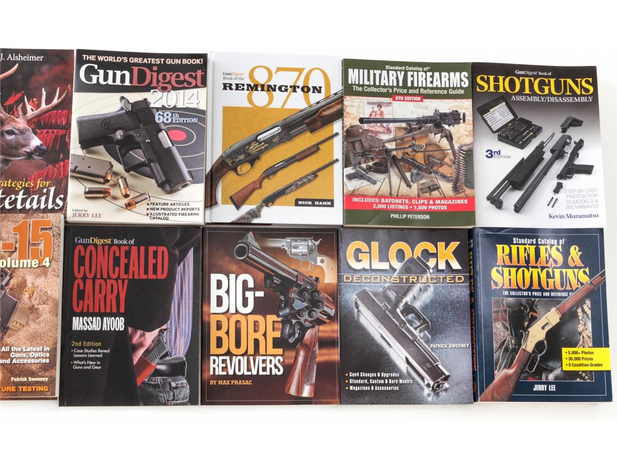 Lot of Sixteen (16)+ Firearms Books: ''Gun Digest Book of Shotguns Assembly/Disassembly''; ''Standard Catalog of Military Firearms''; ''Standard Catalog of Rifles & Shotguns''; ''Big Bore Revolvers''; ''Glock Deconstructed''; ''Gun Digest Book of the Remington 870''; two (2) Gun Digest Books of the AR-15, Vol. 4''; ''Strategies for Whitetails''; ''Gun Digest 2014''; ''Classic Combat Handguns''; ''Classic American Combat Rifles''; Hunter's Specialties ''PhD Gobblers''; John Nosler ''Going Ballistic''; and Western Shooting Journals. All brand new. Est.: $250-$350/lot.