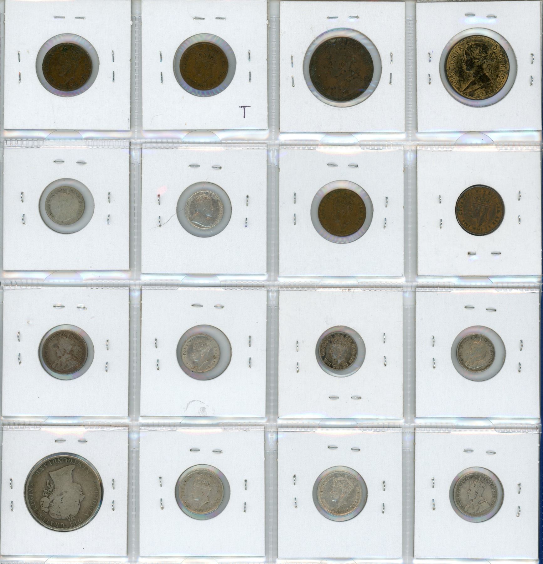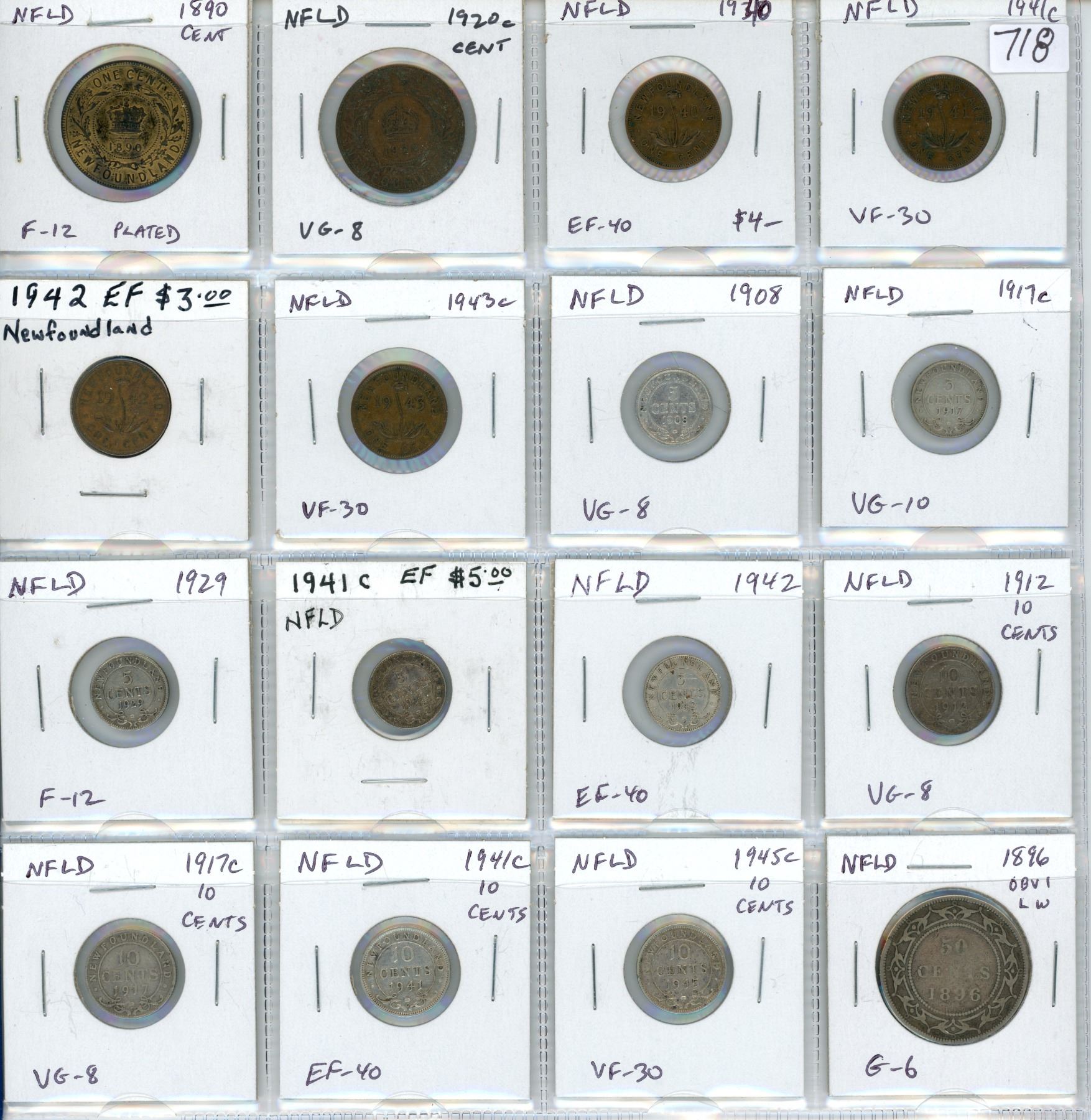 Lot of 16 Newfoundland Coins. Includes 1890 1c, 1920c 1c, 1940 1c, 1941c 1c, 1942 1c, 1943c 1c, 1908 5c, 1917c 5c, 1929 5c, 1941c 5c, 1942 5c, 1912 10c, 1917c 10c, 1941c 10c, 1945c 10c & 1896 Obverse 1 Large W Silver 50 Cents. Coins grade G-6 to EF-40. A nice selection.
